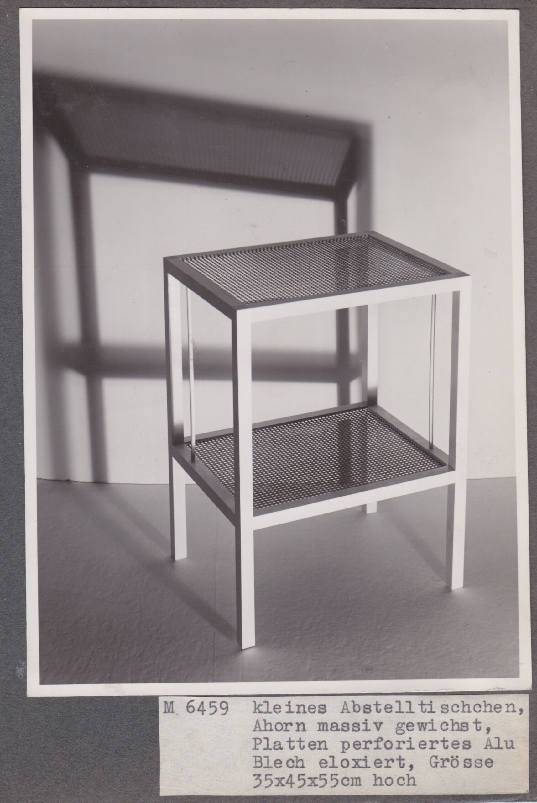 - Text: M 6459 kleines Abstelltischchen,/Ahorn massiv gewichst,/Platten perforiertes Alu/Blech eloxiert, Grösse/35x45x55 cm hoch