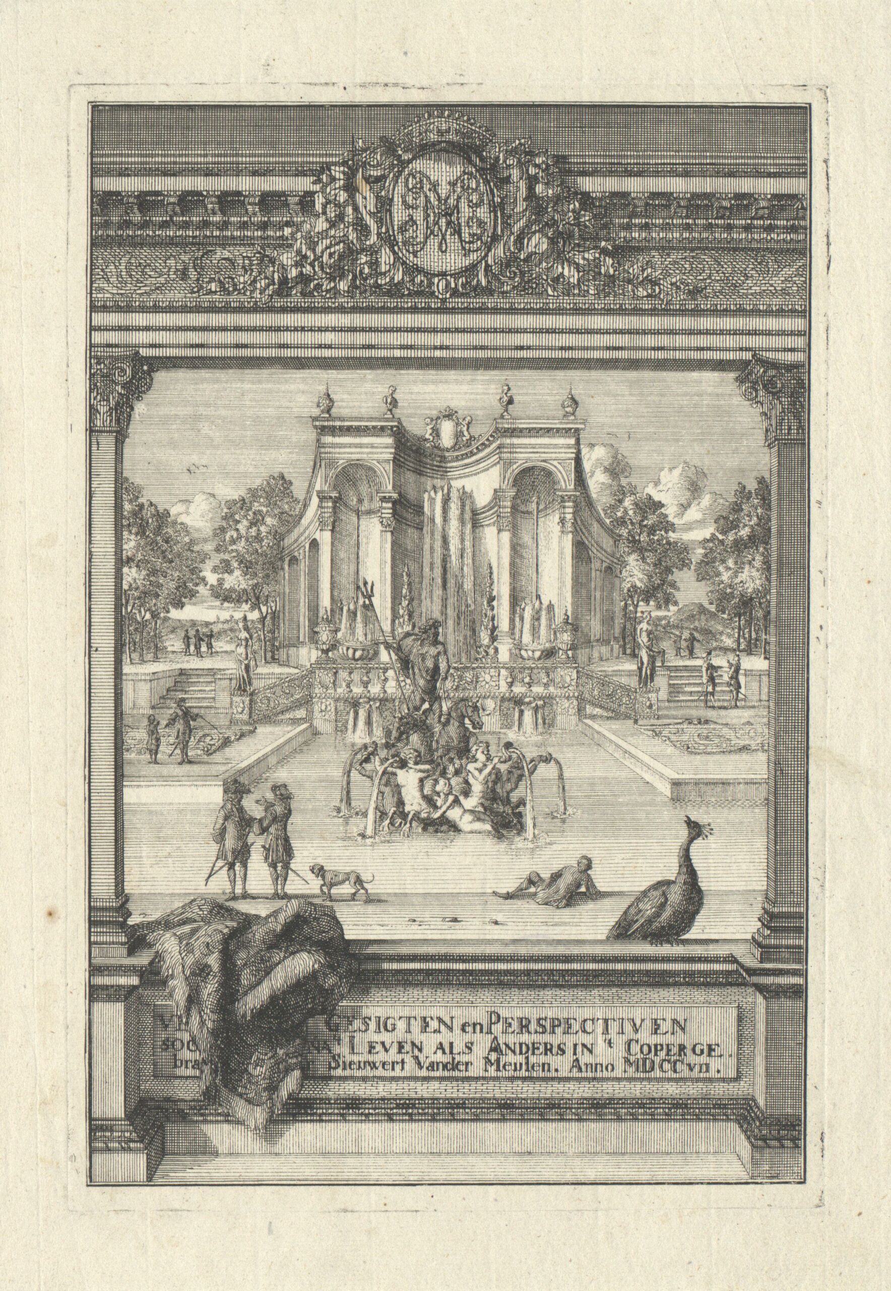 Titelblatt, Ansicht eines Bassins mit Springbrunnen, Titelblatt der Folge „Gesigten en Perspectiven soo nat Leven als Anders”, Sieuwert van der Meulen, MAK Inv.nr. KI 328-1