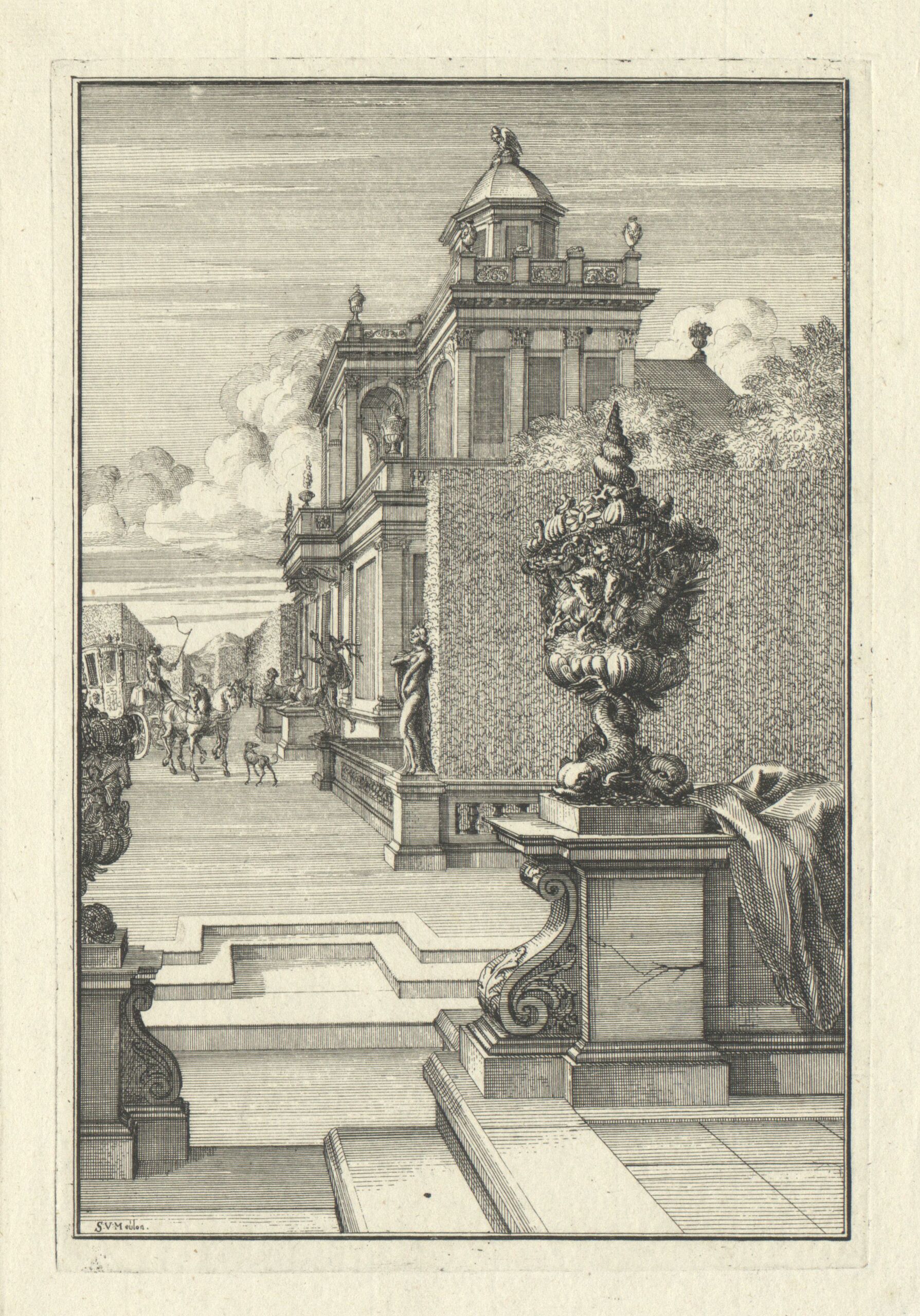 Architekturdarstellung, Ansicht eines Gartens mit Architektur, Blatt aus der Folge „Gesigten en Perspectiven soo nat Leven als Anders”, Sieuwert van der Meulen, MAK Inv.nr. KI 328-4