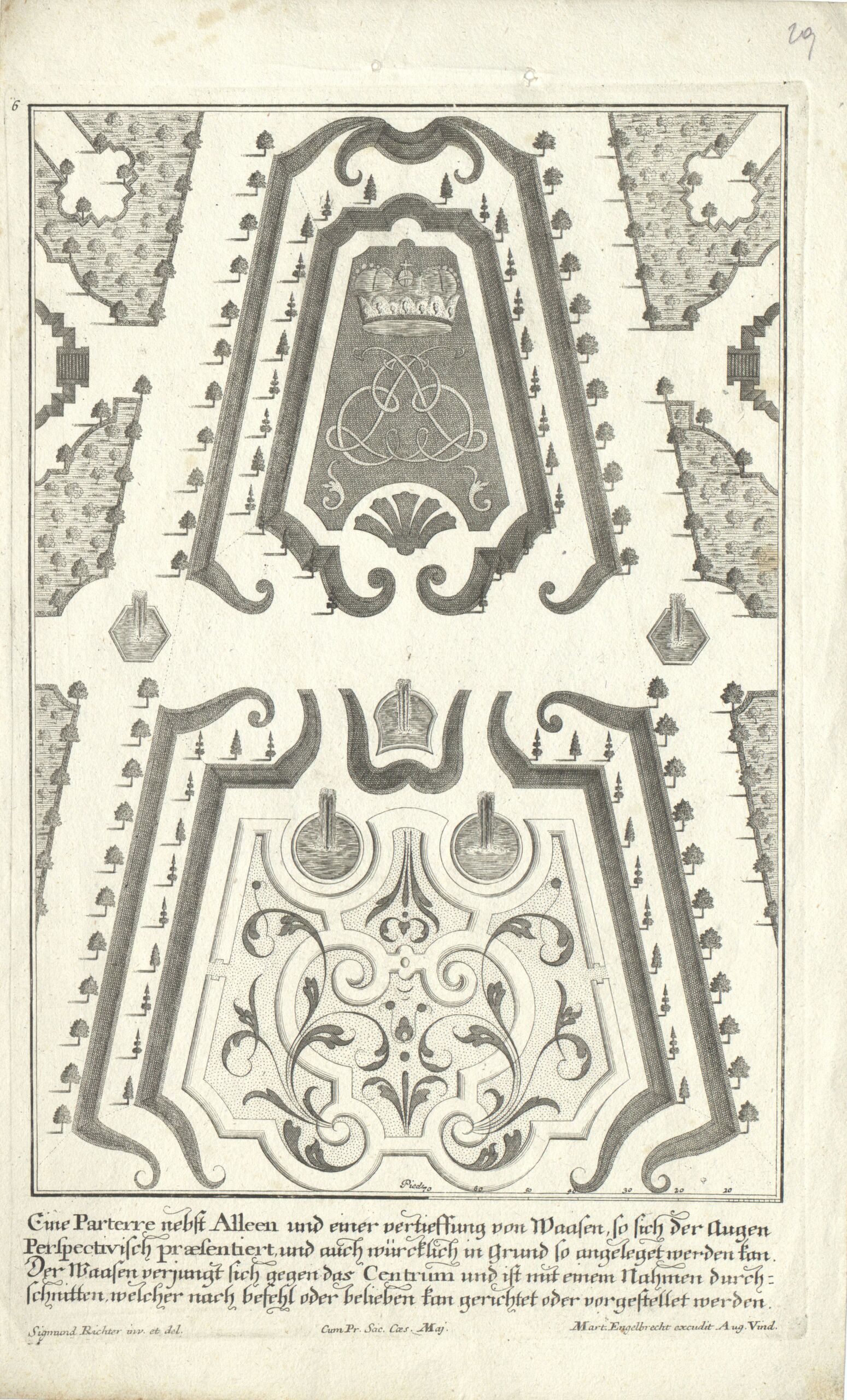- Text am Objekt: Eine Parterre nebst Alleen ... vorgestellet werden. / Sigmund Richter inv. et del. Cum Pr. Sac. Caes. Maj. / Mart. Engelbrecht excudit Aug. Vind. / 6