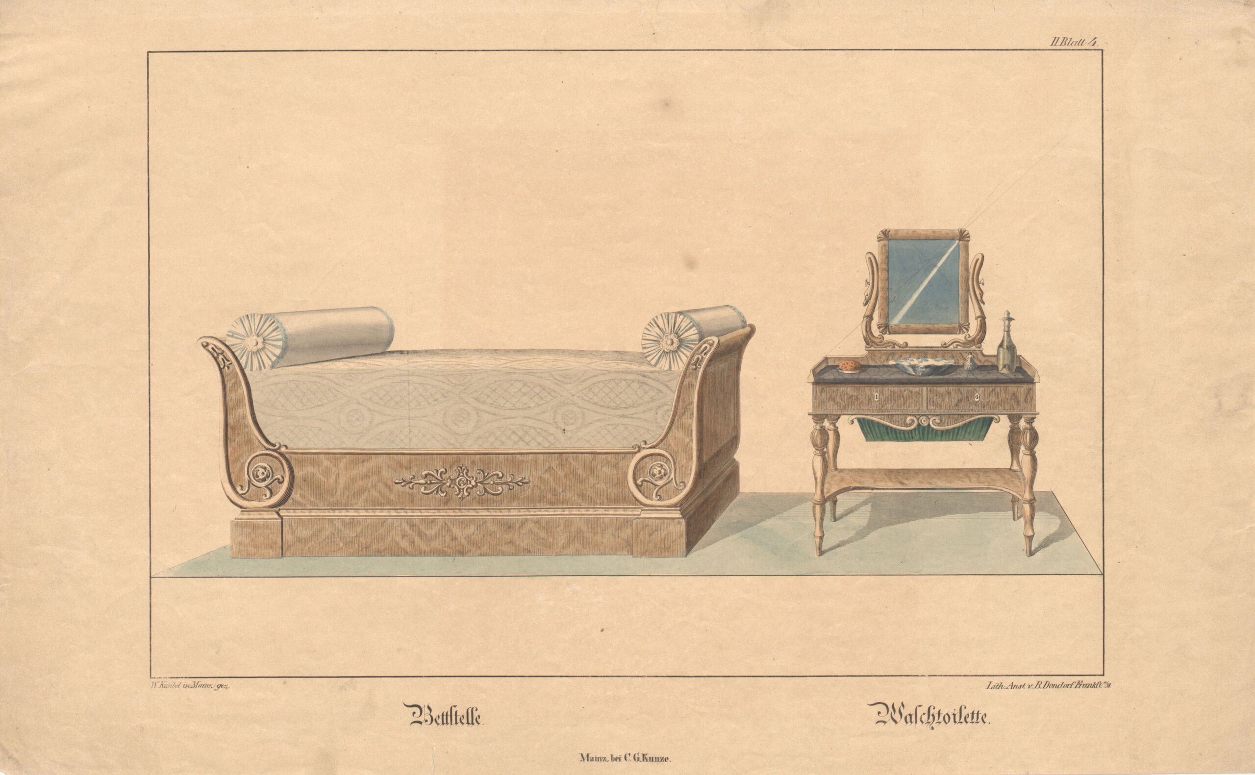 - Text am Objekt: II Blatt 4 / Bettstelle. Waschtoilette / W. Kimbel in Mainz gez. Lith. Anst. v. B. Dondorf in Frankft. a/M. / Mainz bei C. G. Kunze