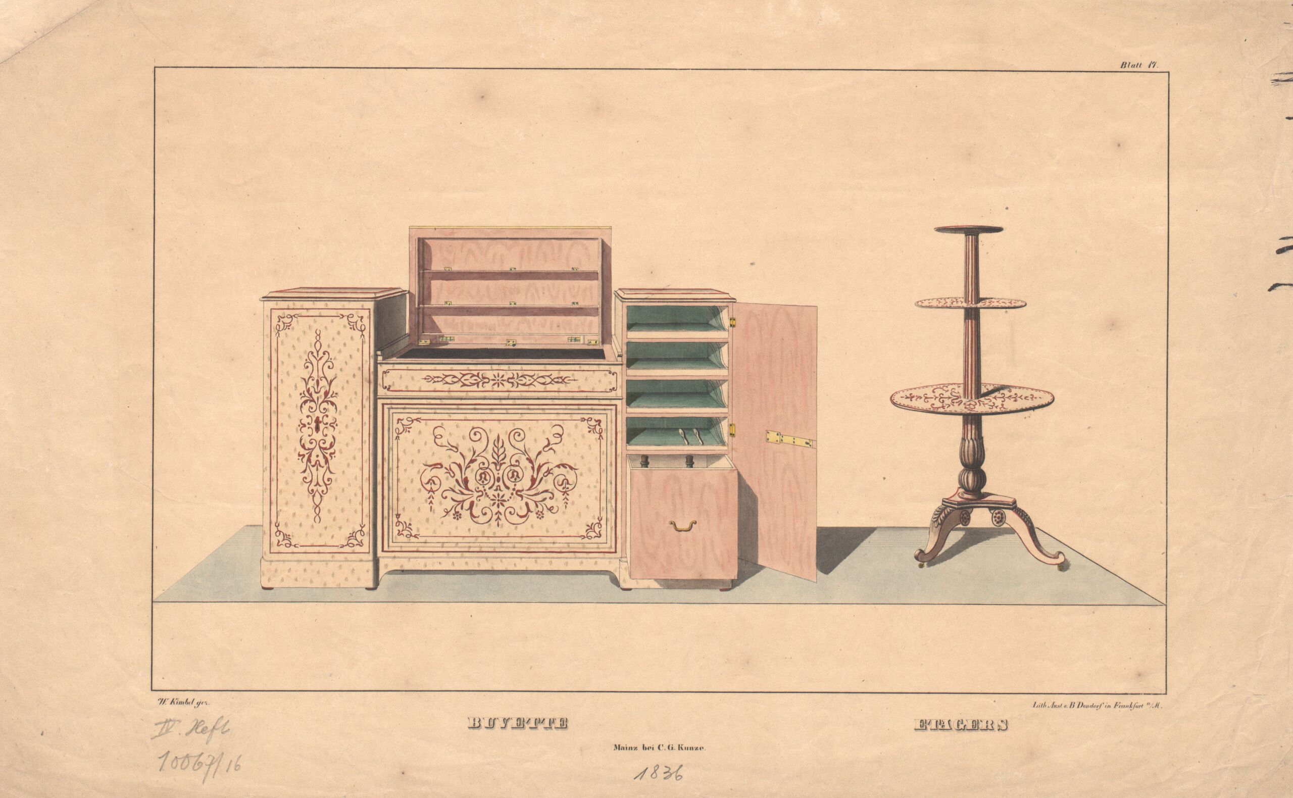 - „Buvette, Etagers“, Blatt 17 aus dem 4. Heft der Folge „Journal für Möbelschreiner und Tapezierer, gezeichnet von Wilhelm Kimbel, Ebenist und Zeichenlehrer in Mainz etc.“, herausgegeben von C. G. Kunze (vom Bearbeiter vergebener Titel)