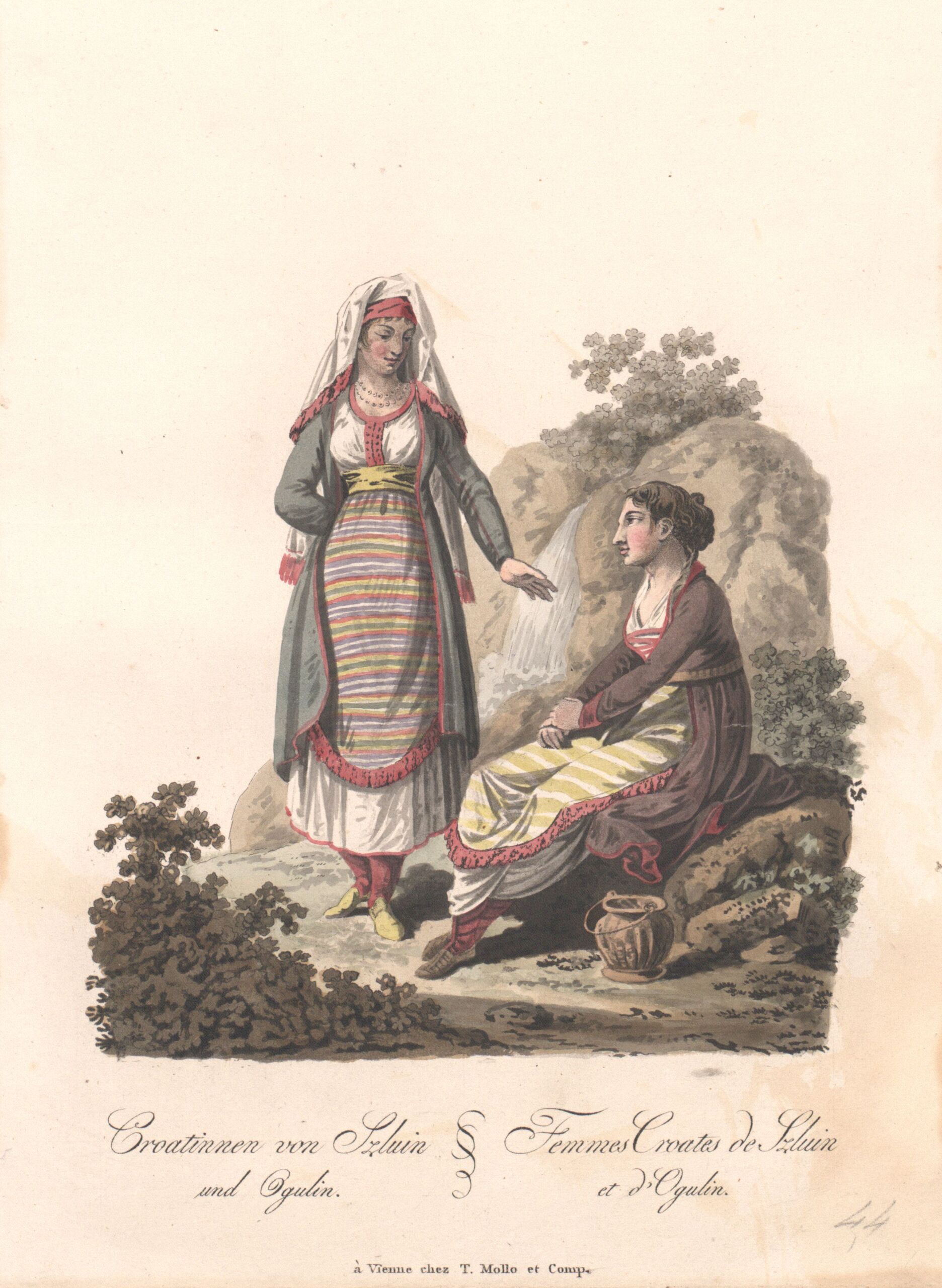 - „Croatinnen von Szluin und Ogulin“, Blatt aus der Folge der Volkstrachten aus der österreichischen Monarchie, herausgegeben von T. Mollo et Comp. (vom Bearbeiter vergebener Titel)