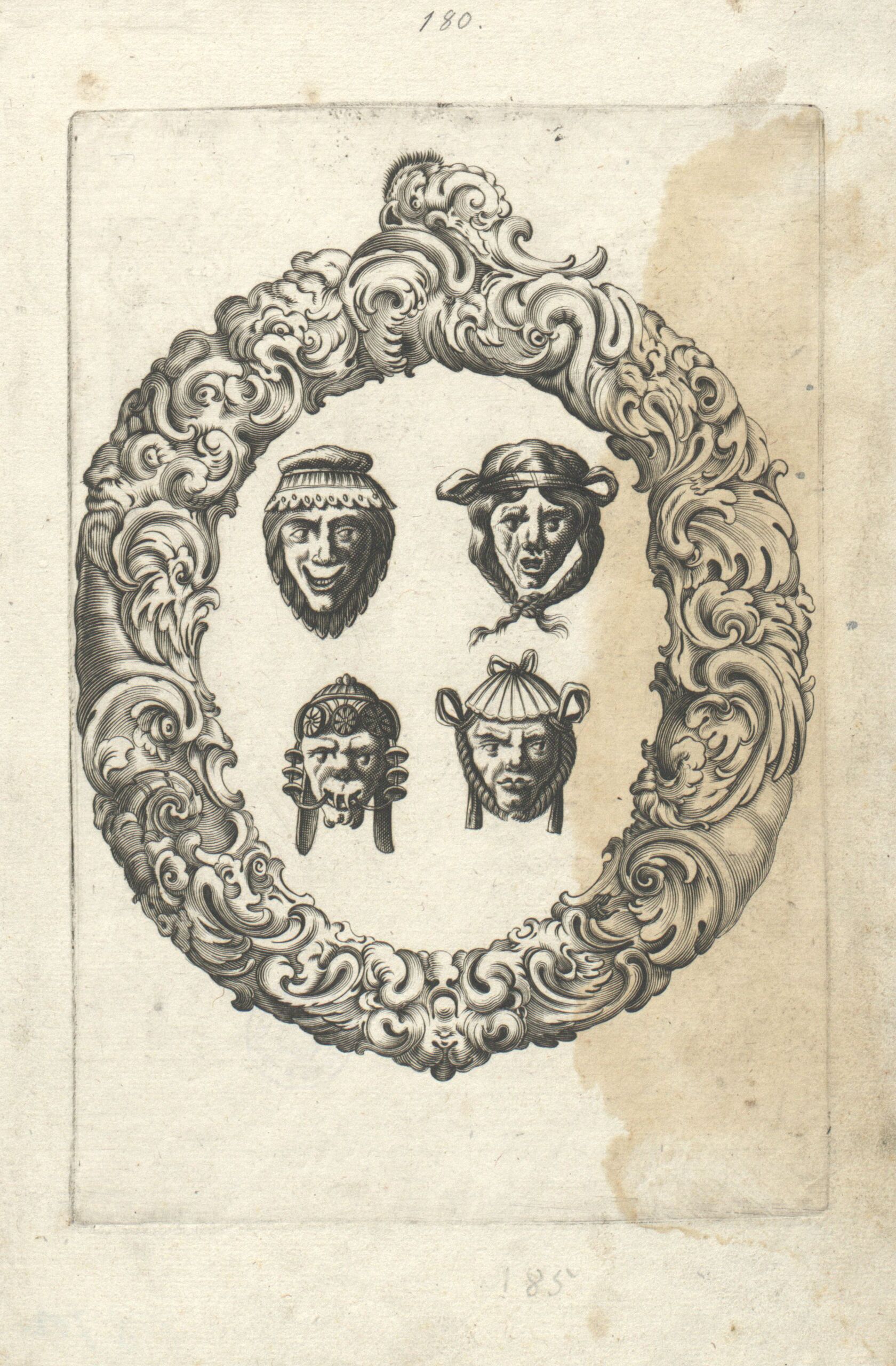 - Die Buchstabe O in Knorpelwerk, umgeben von Masken, Blatt aus einer Folge von Nachstichen nach der Folge „Libellus Novus Elementorum Latinorum“, herausgegeben von Peter Aubry (vom Bearbeiter vergebener Titel)