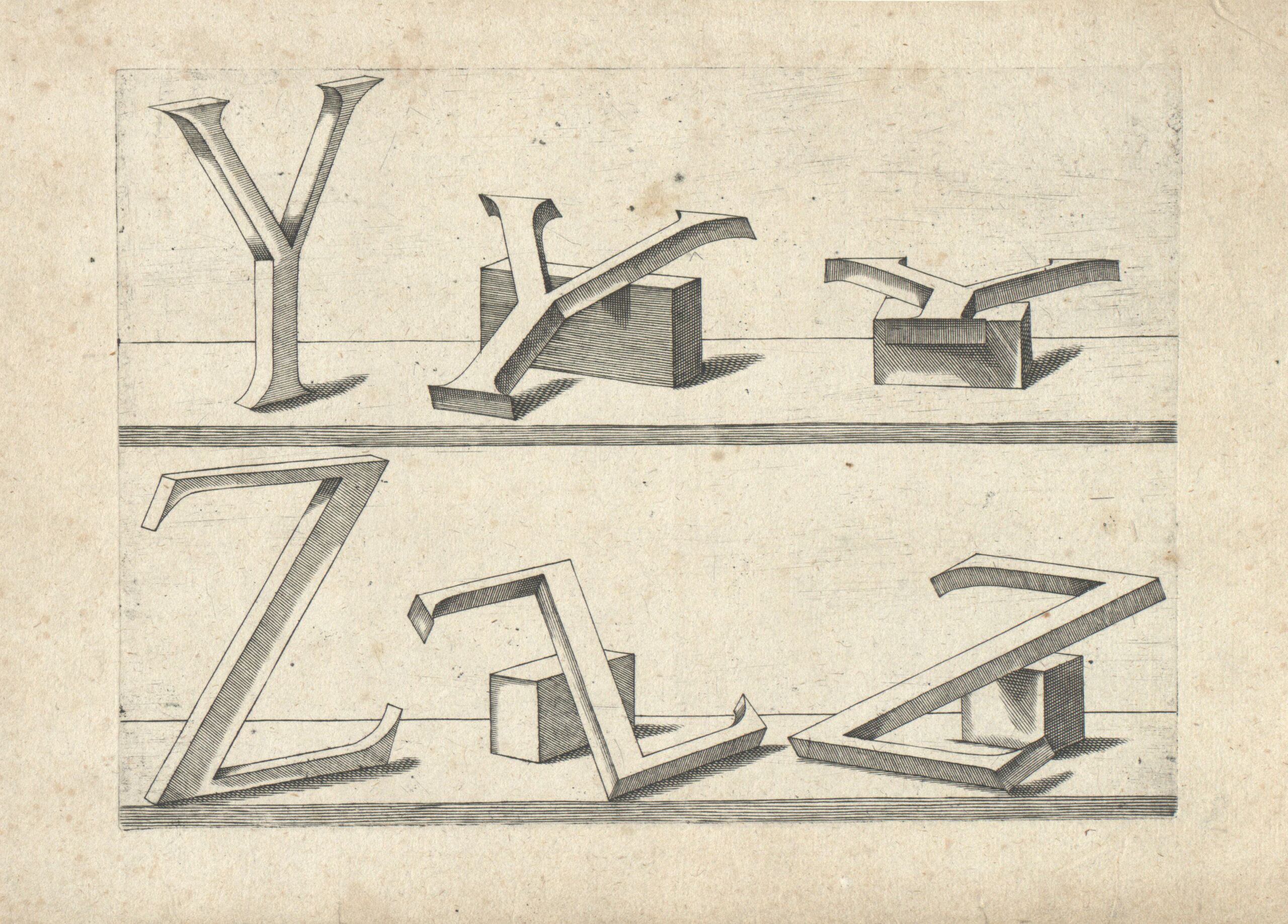 - Die Buchstaben Y und Z in perspektivischer Verkürzung mit Würfeln und anderen geometrischen Körpern, Blatt aus einer Folge von Antiqua- Versalien, herausgegeben von Stephan Michelspacher (vom Bearbeiter vergebener Titel)