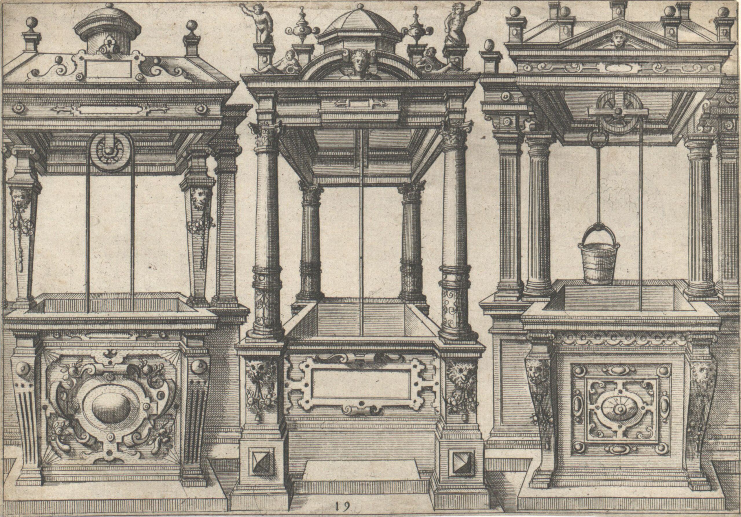 Architekturdarstellung, Drei Ziehbrunnen, Blatt 19 aus der Folge der kleinen Brunnen, herausgegeben von Ph. Galle, Hans Vredeman de Vries, MAK Inv.nr. KI 1-955-33