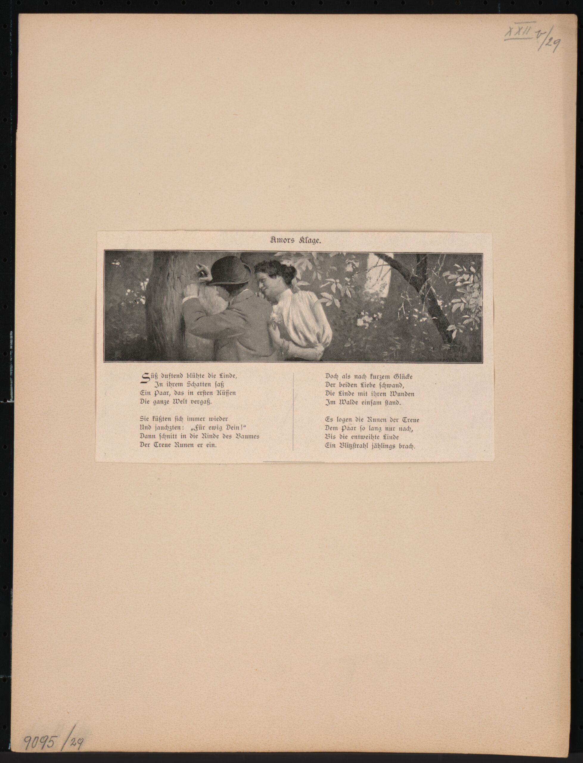 - Text am Objekt (mittig oben) : Süß duftend blühte die Linde, / In ihrem Schatten saß / Ein Paar, das in ersten Küssen / Die ganze Welt vergaß. / Sie küßten sich immer wieder / Und jauchzten: "Für ewig Dein!" / Dann schnitt in die Rinde des Baumes / Der Treue Runen er ein. / Doch als nach kurzem Glücke / Der beiden Liebe schwand, / Die Linde mit ihren Wunden / Im Walde einsam stand. / Es logen die RUnen der Treue / Dem Paar so lang nur nach, / Bis die entweihte Linde / Ein Blitzstrahl jählings brach.