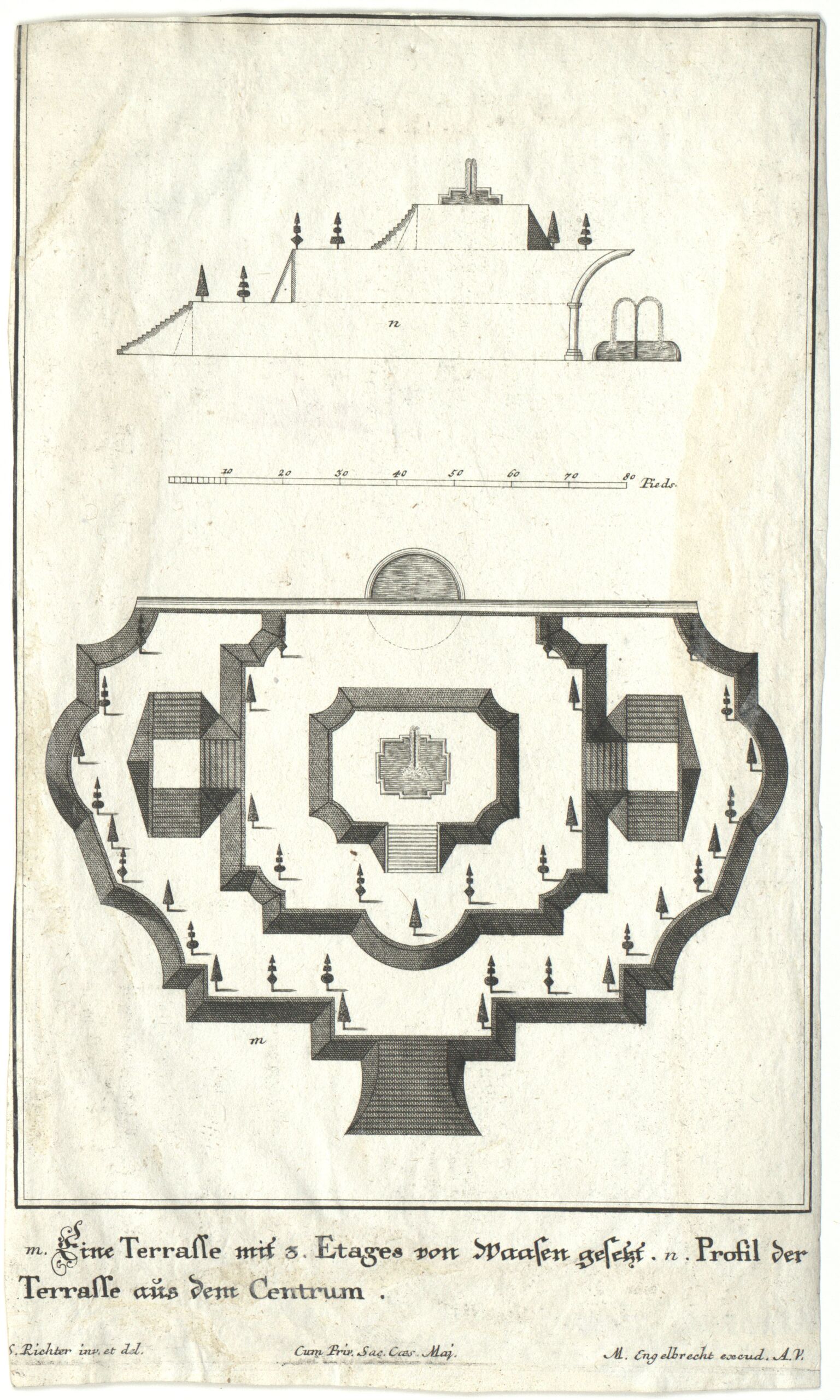 - Text am Objekt: m. Eine Terrasse ... Centrum. / S. Richter inv. et del. / Cum Priv. Cas. Caes. Maj. / M. Engelbrecht excud. A.V.