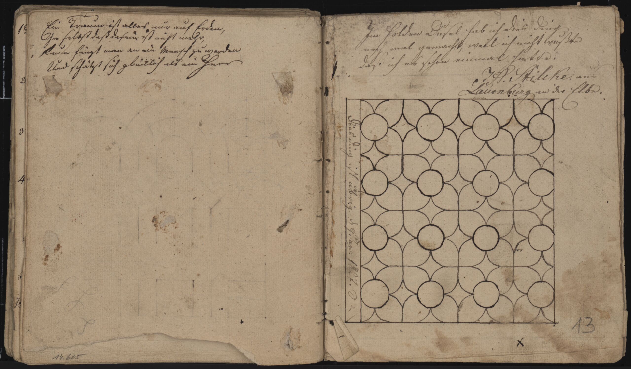 - Text am Objekt: Im holden Dusel hab ich dies Ding / noch mal gemacht, weil ich nicht wußte daß cih es schon einmal hatte. / J. A. Stickle und / Lauenburg an der Elbe.; Das Ding ist übrig den 4. Jan. 1827 [Feder in Schwarz]; [Verso]: Hier ist nichts daraus geworden. / Warum, weiß ich selber nicht. [Feder in Schwarz]