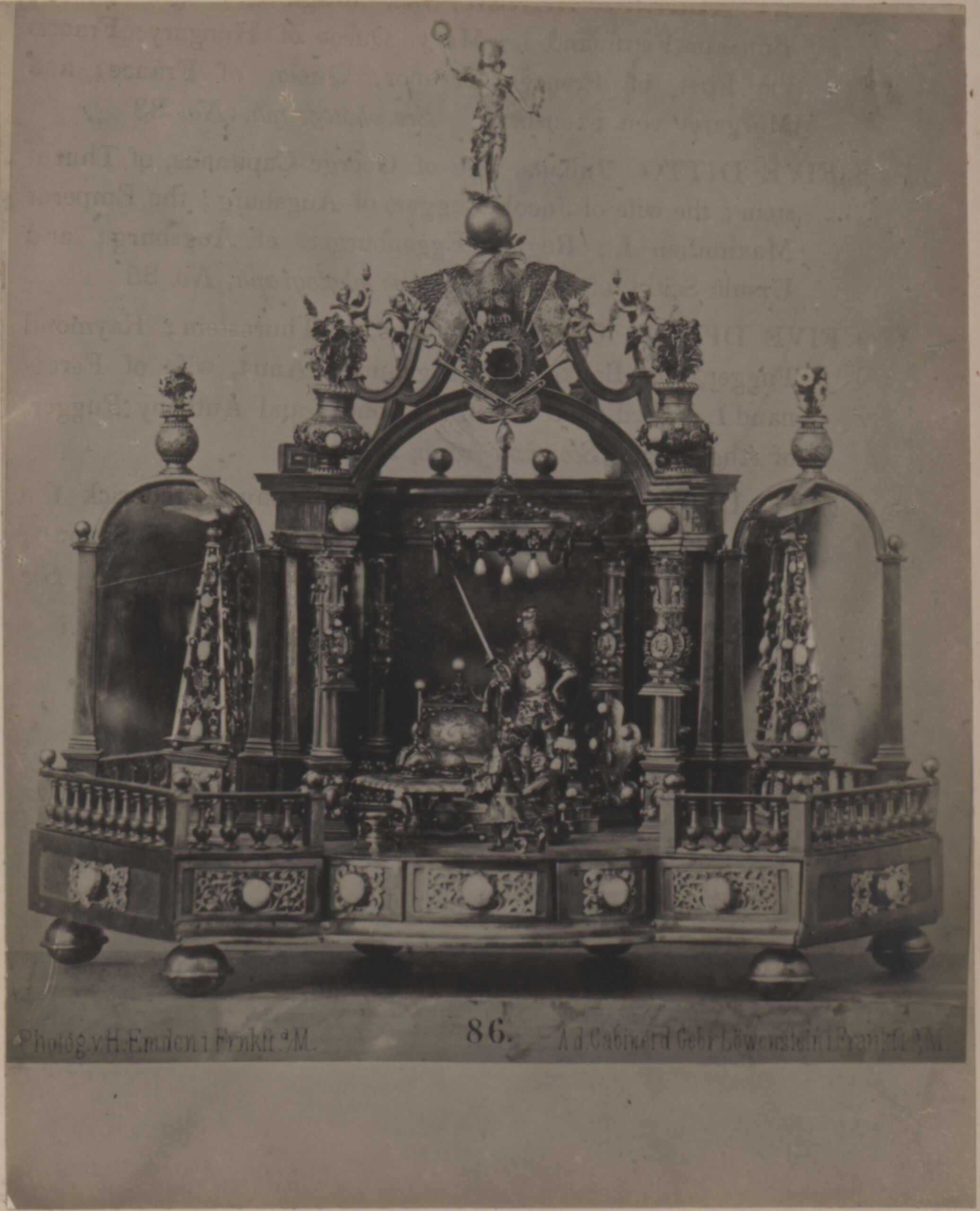 - Text am Objekt: [Untersatzkarton, links oben]: Nr. 504: Silberstatuetten: Europa u. Nessus und / Dejanira; Nr. 636: Terracottafigur mit 4 Köpfen.[Untersatzkarton, rechts oben]: Nr. 802: Kassette m. Lapislazuliplatten; Nr. 915: Holz- / figur g. hl. Sebastian; Nr. 657: Kassette, Silber vergoldet.[Untersatzkarton, links unten]: Nr. 237: Humpen, Silber vergoldet; Nr. 501: Silberpokal, / vergoldet, italienisch; Nr. 375: Italien. Silberhumpen.[Untersatzkarton, rechts unten]: Krönungshalle Kaiser Karls VI.