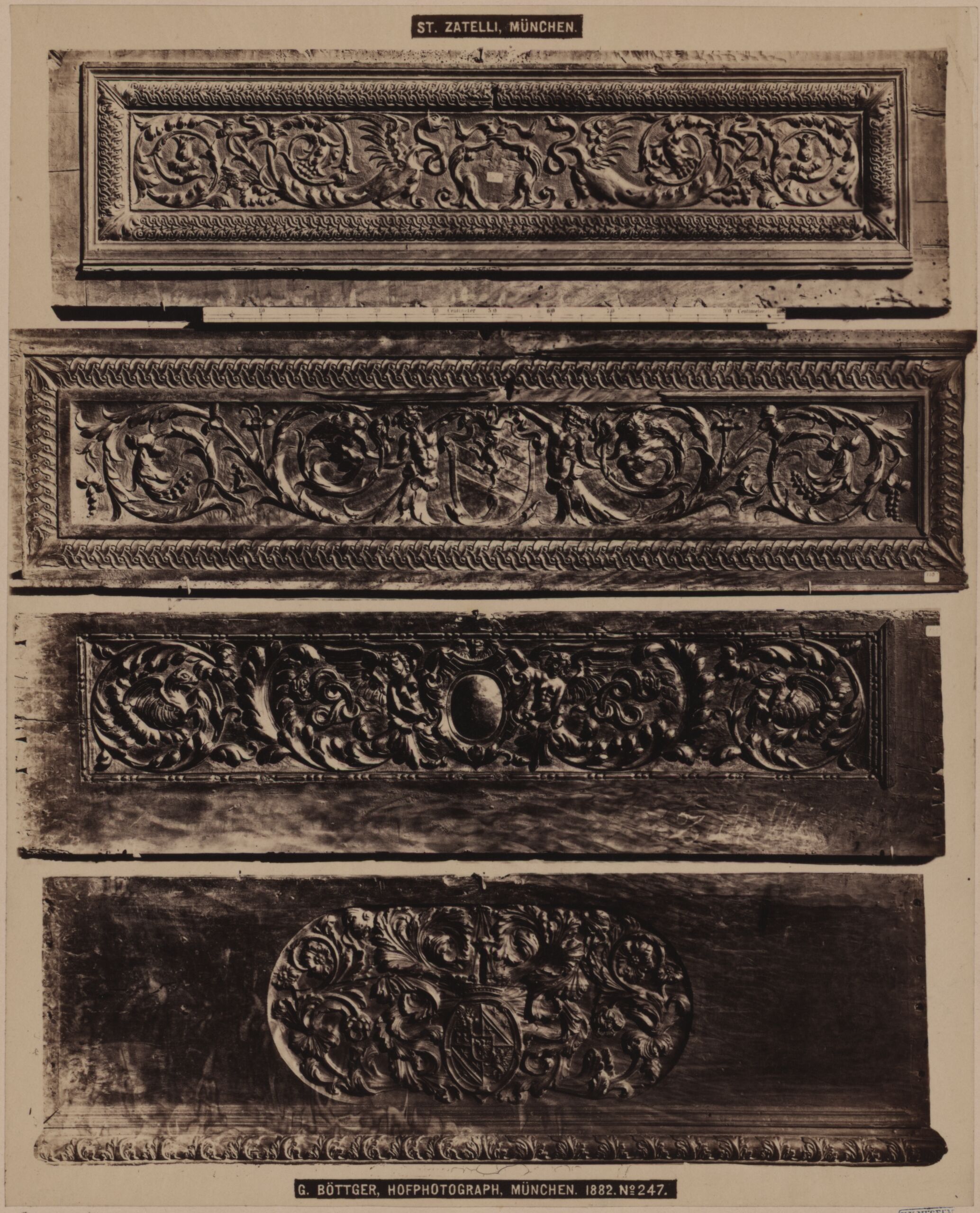 - Text am Objekt: [mittig oben]: ST. ZATELLI; München. [mittig unten]: G. BÖTTGER; HOFFOTOGRAPH; MÜNCHEN. 1882. No. 247. [Untersatzkarton, rechts]: Renaissancetruhen - Wände