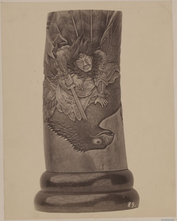- Text am Objekt: [Untersatzkarton, mittig, aufgeklebt]: 15. Zwei Stühle mit hohen Rücklehnen. Ebenholz mit / Elfenbein eingelegt. Phantastisches Rahmenwerk, / Trophäen und gravirte Zeichnungen. 1, 10 hoch. / Italien um 1600. S. K. u. K. H. der Kronprinz.