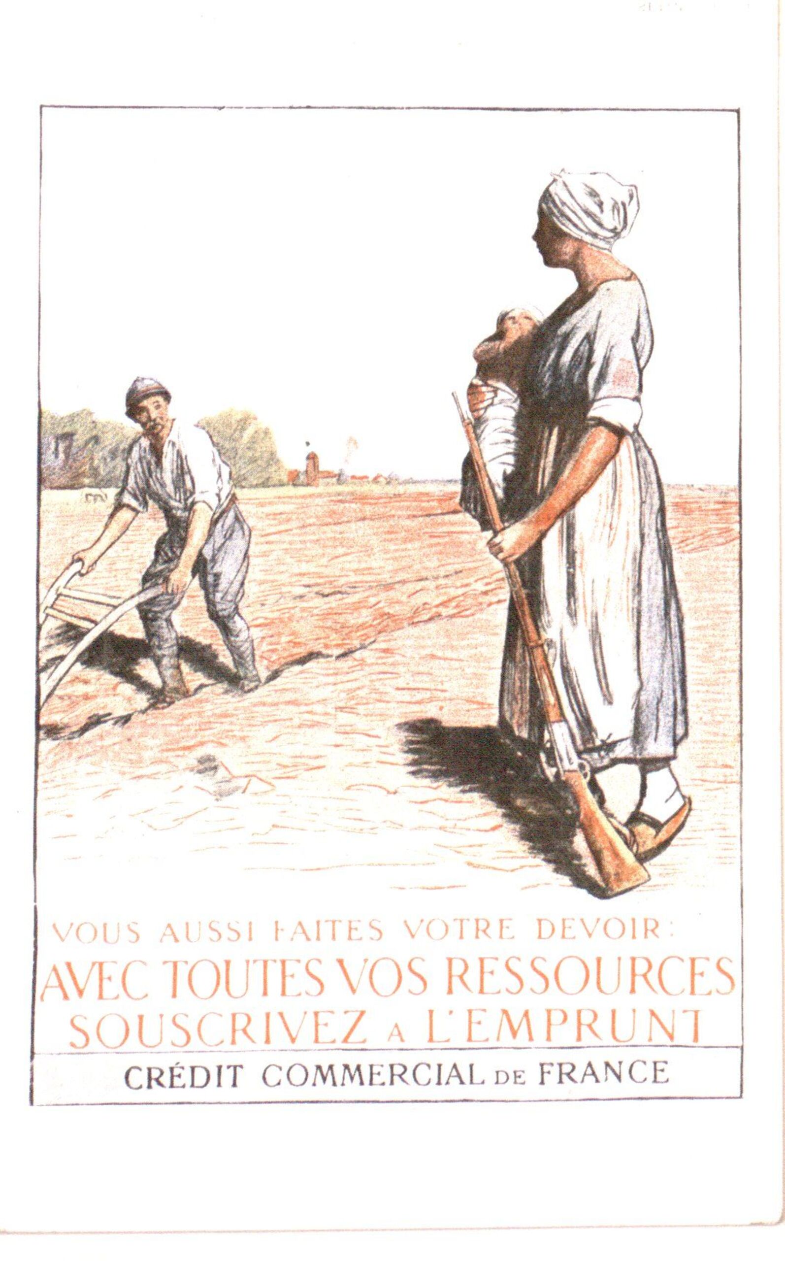 - Französische Künstlerpostkarte der nationalen Kriegsanleihe anlässlich ein pflügender Mann und eine Frau mit einem Gewehr auf einem Feld (vom Bearbeiter vergebener Titel)