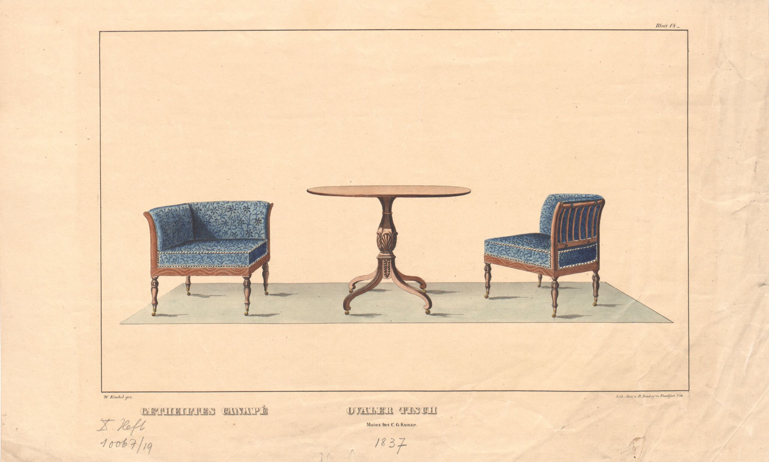 - Text am Objekt: Blatt 18 / GETHEILTES CANAPÉ OVALER TISCH / W. Kimbel gez. Lith. Anst. v. B. Dondorf in Frankfurt a/M. / Mainz bei C. G. Kunze