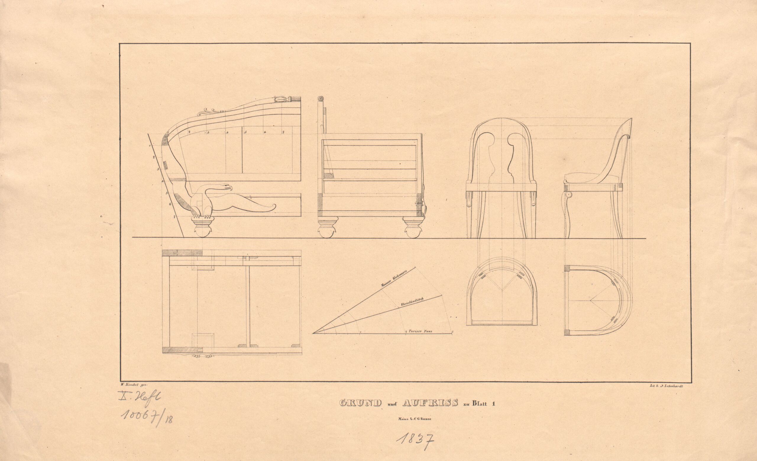 - Grund- und Aufriß zu Blatt 1 (Couch und Stuhl) aus dem 10. Heft der Folge „Journal für Möbelschreiner und Tapezierer, gezeichnet von Wilhelm Kimbel, Ebenist und Zeichenlehrer in Mainz etc.“, herausgegeben von C. G. Kunze (vom Bearbeiter vergebener Titel)