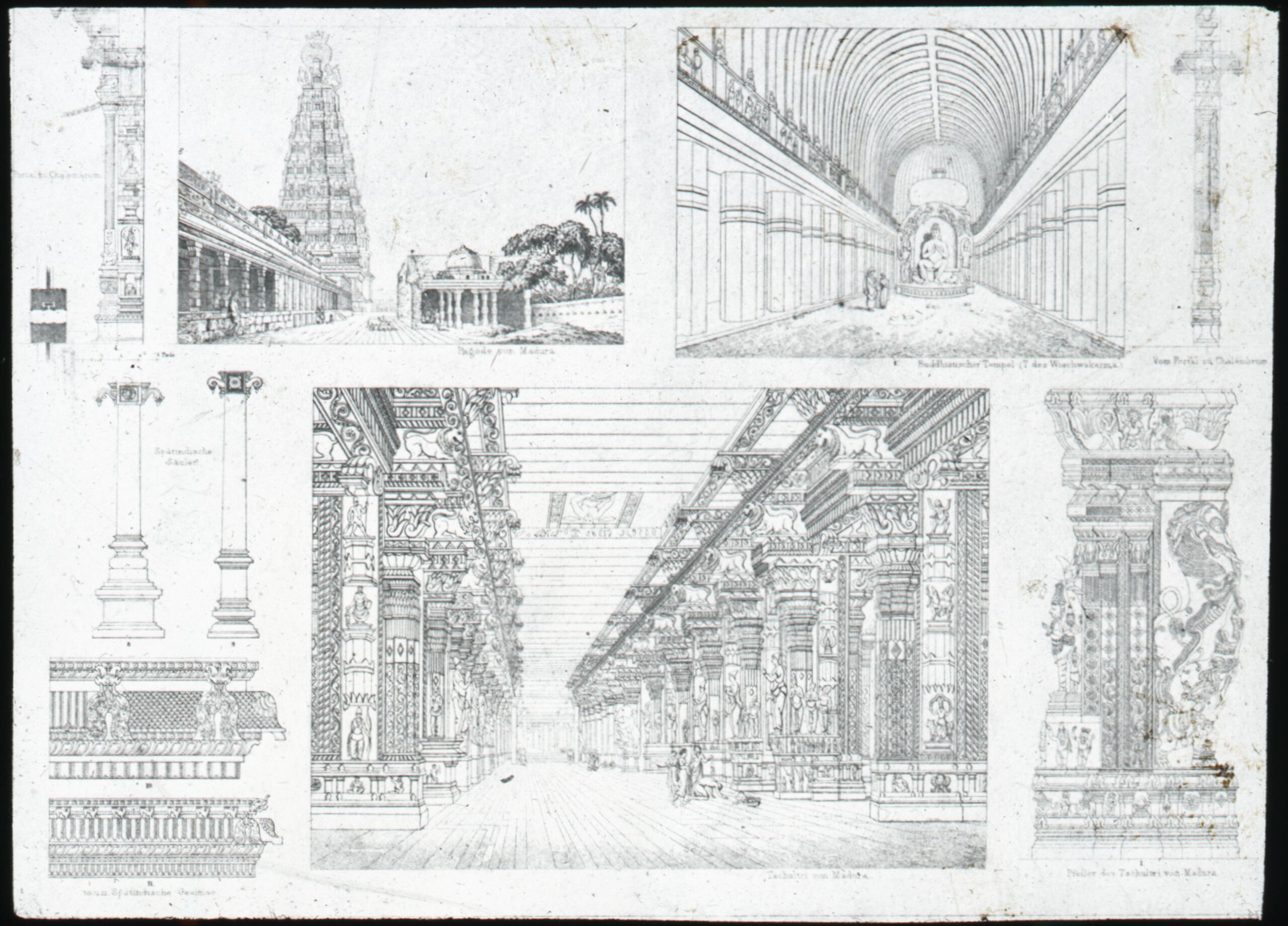 - Text am Objekt: Pagode von Madura. Buddhistischer Tempel (T des Wiachwakarma). Vom Portal in Chalembrom. Spätindische Säulen. [...] von Madua. Pfeiler des Tschultri von Madura
