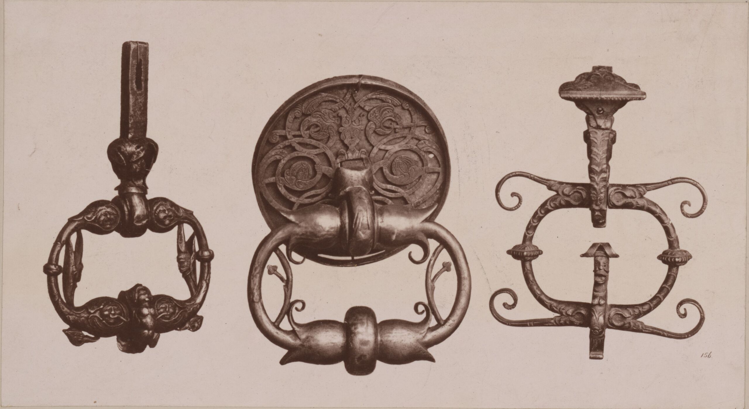 - Lichtdruck dreier Türklopfer aus Eisen aus dem 16. Jahrhundert (vom Bearbeiter vergebener Titel)