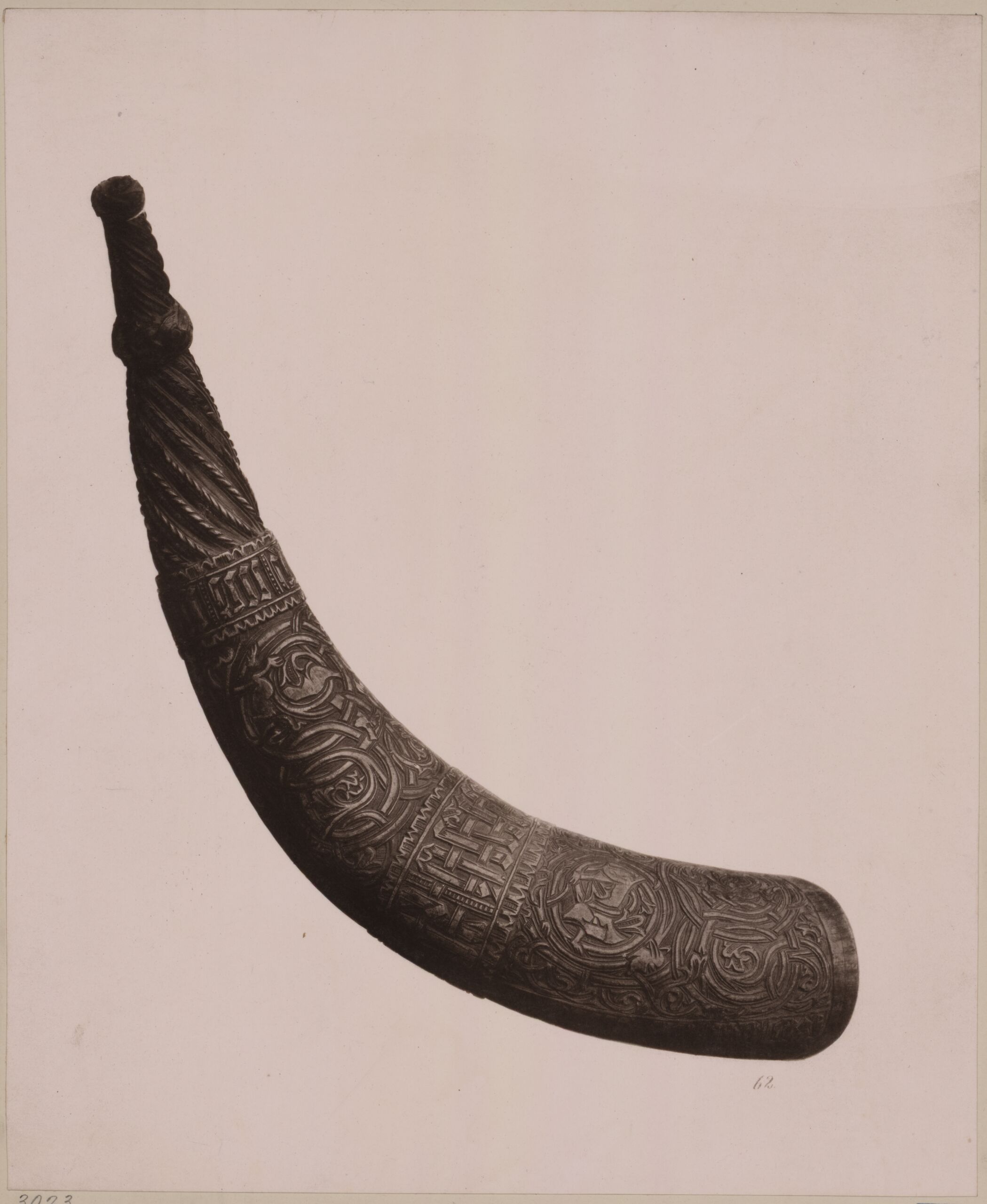 - Lichtdruck eines Jagdhorns mit gotischen Rankenornamenten aus dem 15. Jahrhundert (vom Bearbeiter vergebener Titel)