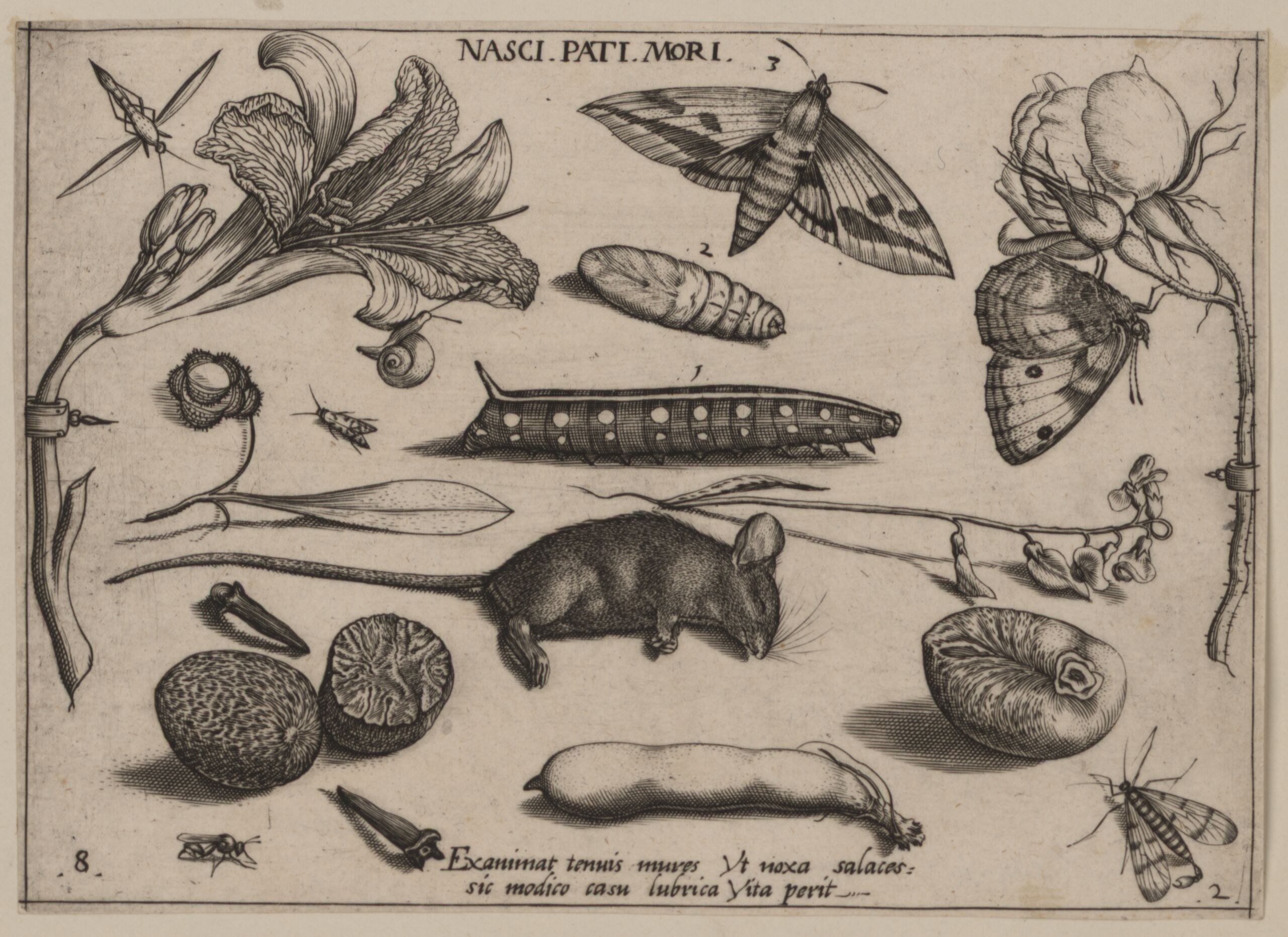 eine tote Maus, Wolfmilchschwärmer (Puppe, Raupe, Falter), Blüten, Insekten, Früchte (Muskatnuss u.a.) und Inschriften