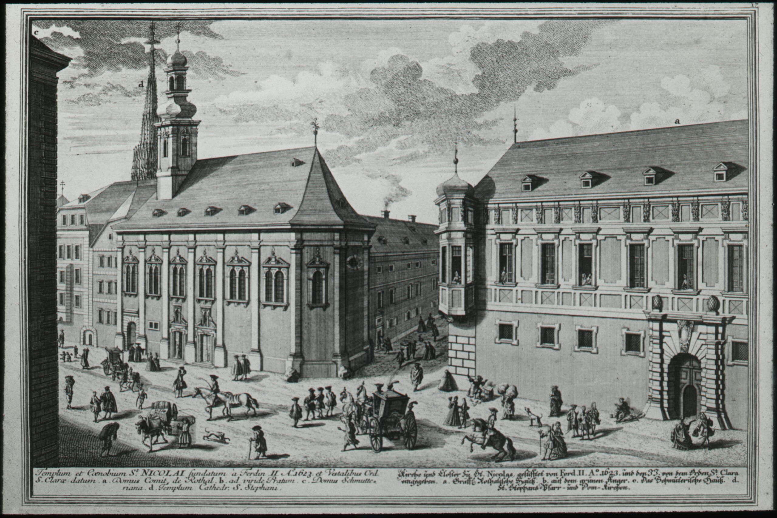 - Text am Objekt: Templum et Coenobium St. Nicolai fundatum a Ferdin II. Anno 1623 et Vestalibus Ord. S. Clarae datum [...] Kirche und Closter zu St. Nicolas, gestifftet von Ferd. II. Anno 1623. und den JJ. von dem Orden St. Clara eingegeben. [...]