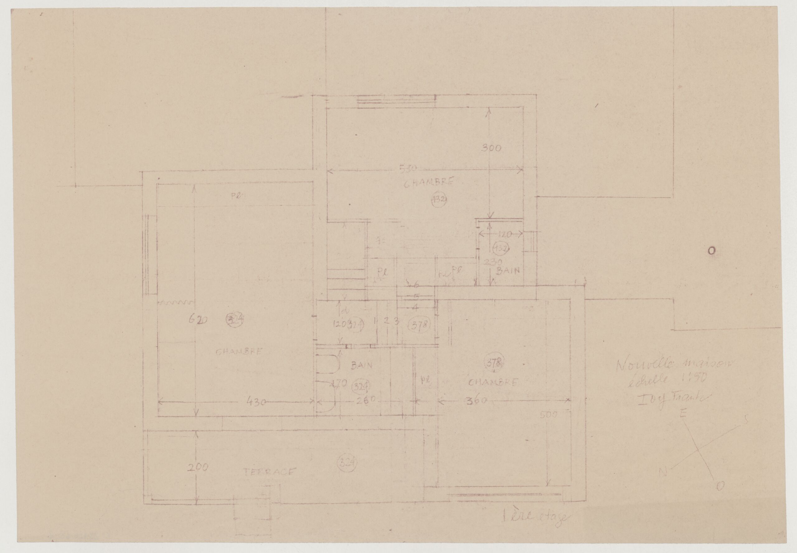 - Text am Objekt (Vorderseite) : Pl / 620 / 324 / CHAMBRE / 430 / 300 / 530 / CHAMBRE / 132 / 212 / 43 / Pl / Pl / 120 / 130 / BAIN / 6 / 5 / 4 / d / 120 / 324 / 1 2 3 / 378 / BAIN / 170 / 324 / Pl / 260 / 200 TERRACE / 324 / 378 / CHAMBRE / 360 / 500 / 1ère etage