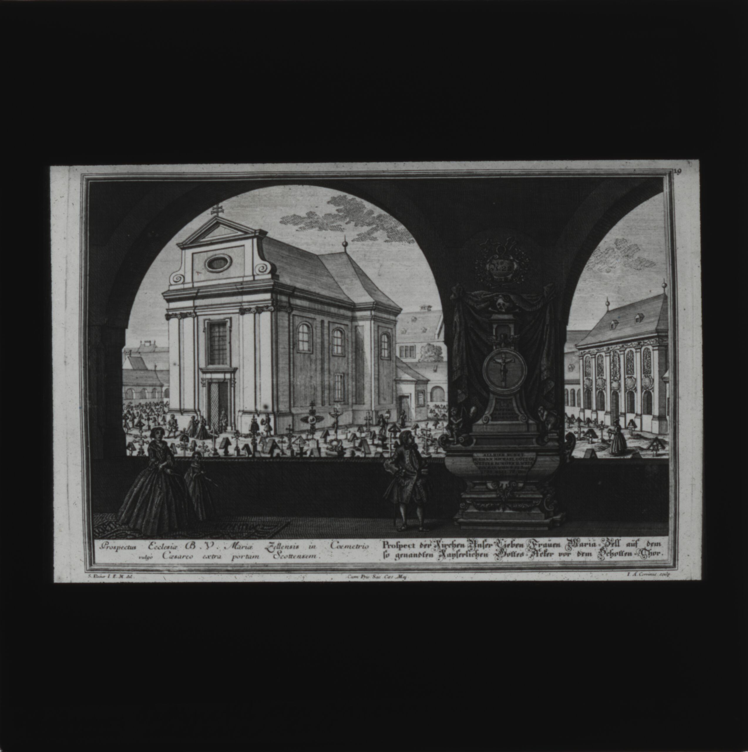 - Text am Objekt: Prospectus Ecclesiae B. V. Mariae Zellensis in Coemetrio vulgò Caesareo extra portam Scottensem = Prospect der Kirchen Unser Lieben Frauen Maria-Zell auf dem so genandten Kayserlichen Gottes-Acker vor dem Schotten-Thor