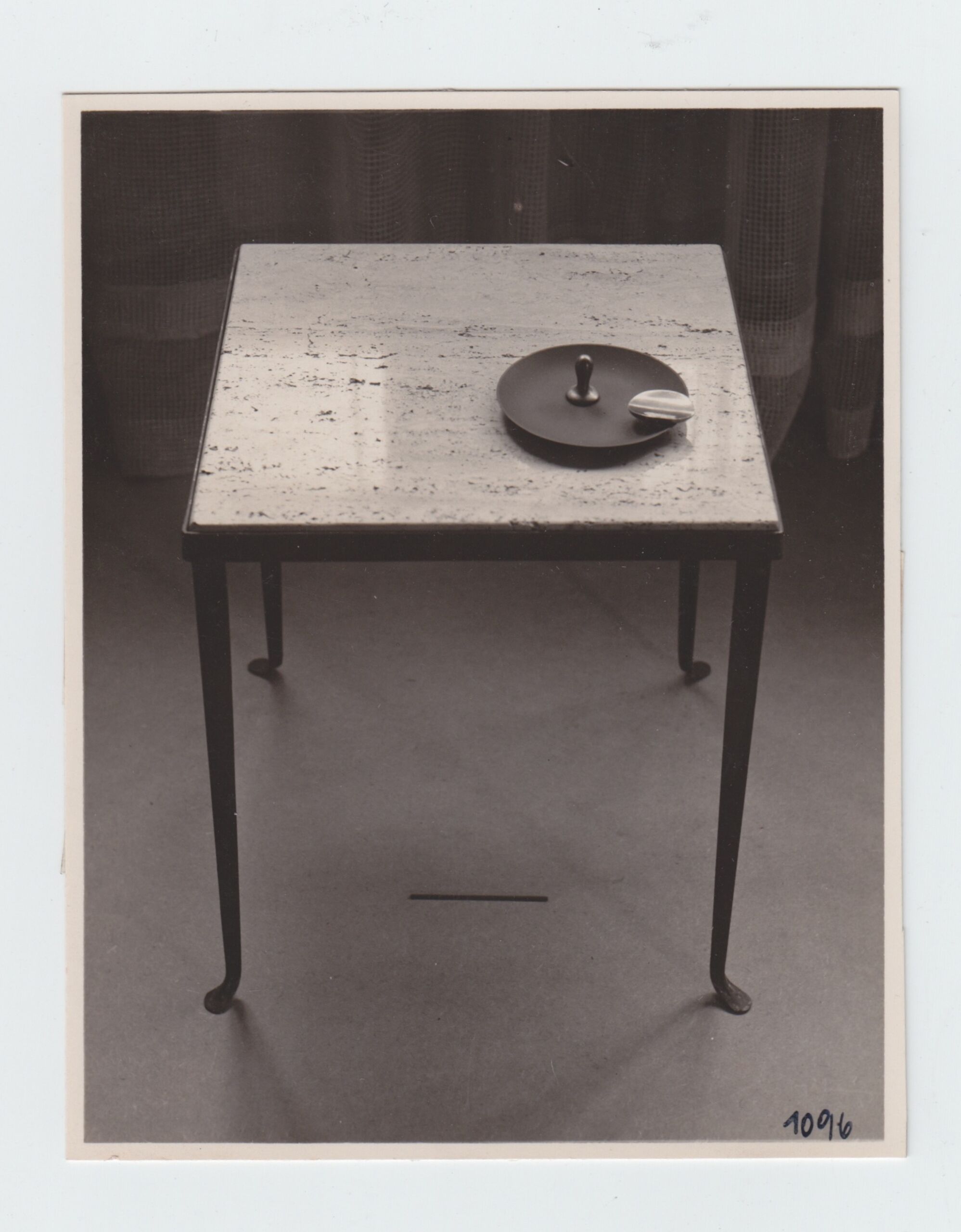 - Text: No.4991 Kleiner Blumentisch oder Rauchtisch/ in Schmiedeeisen mit Travertin Steinplatte/RM.30.--/No.4896 Aschenschale (ohne Töter) RM.5.--