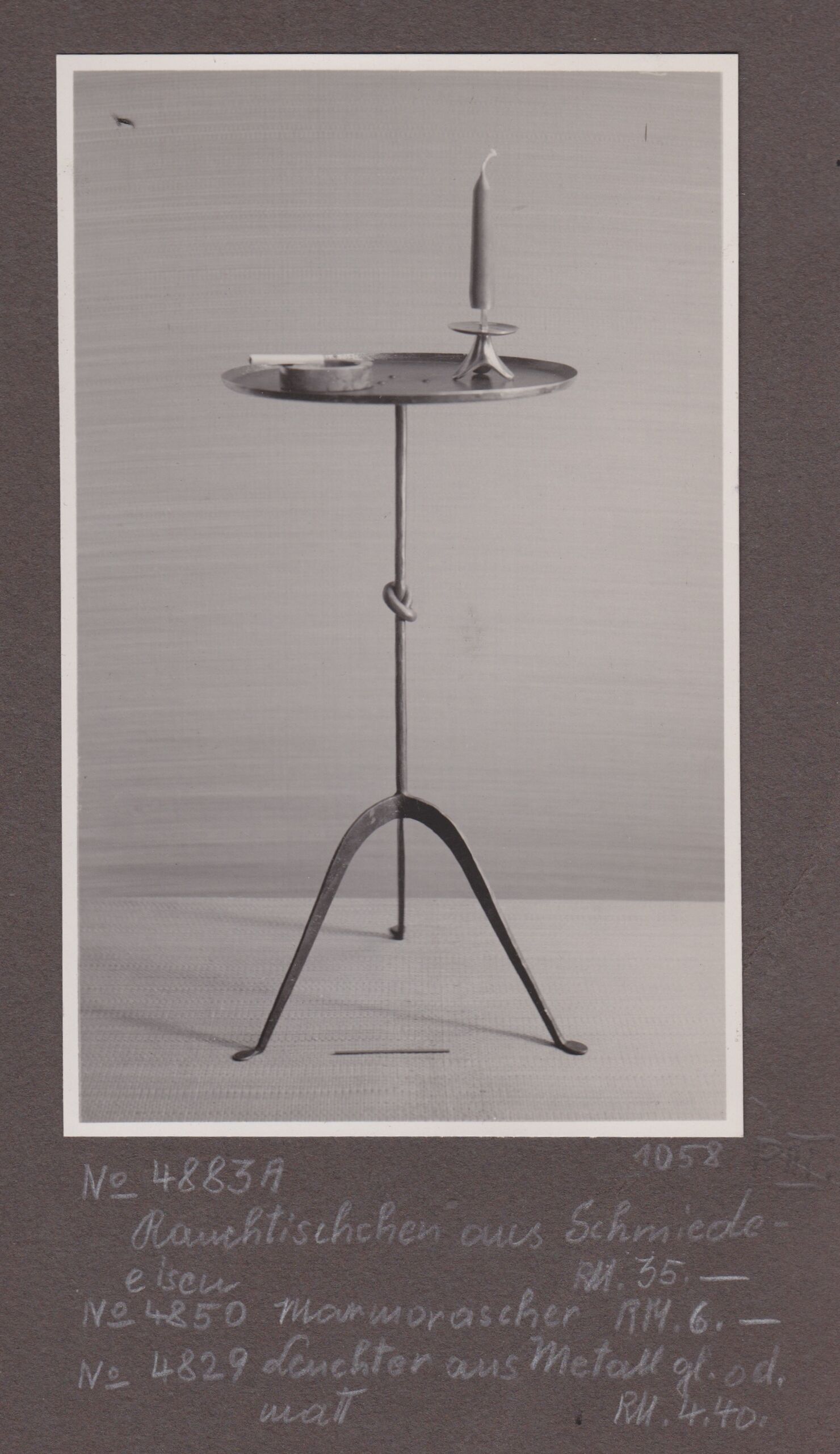 - Text: No 48823A Rauchtischchen aus Schmiede-/eisen RM.32.-/No 4850 Marmorascher RM.6.-/No 4829 Leuchter aus Metall gl. od./matt RM.4.40