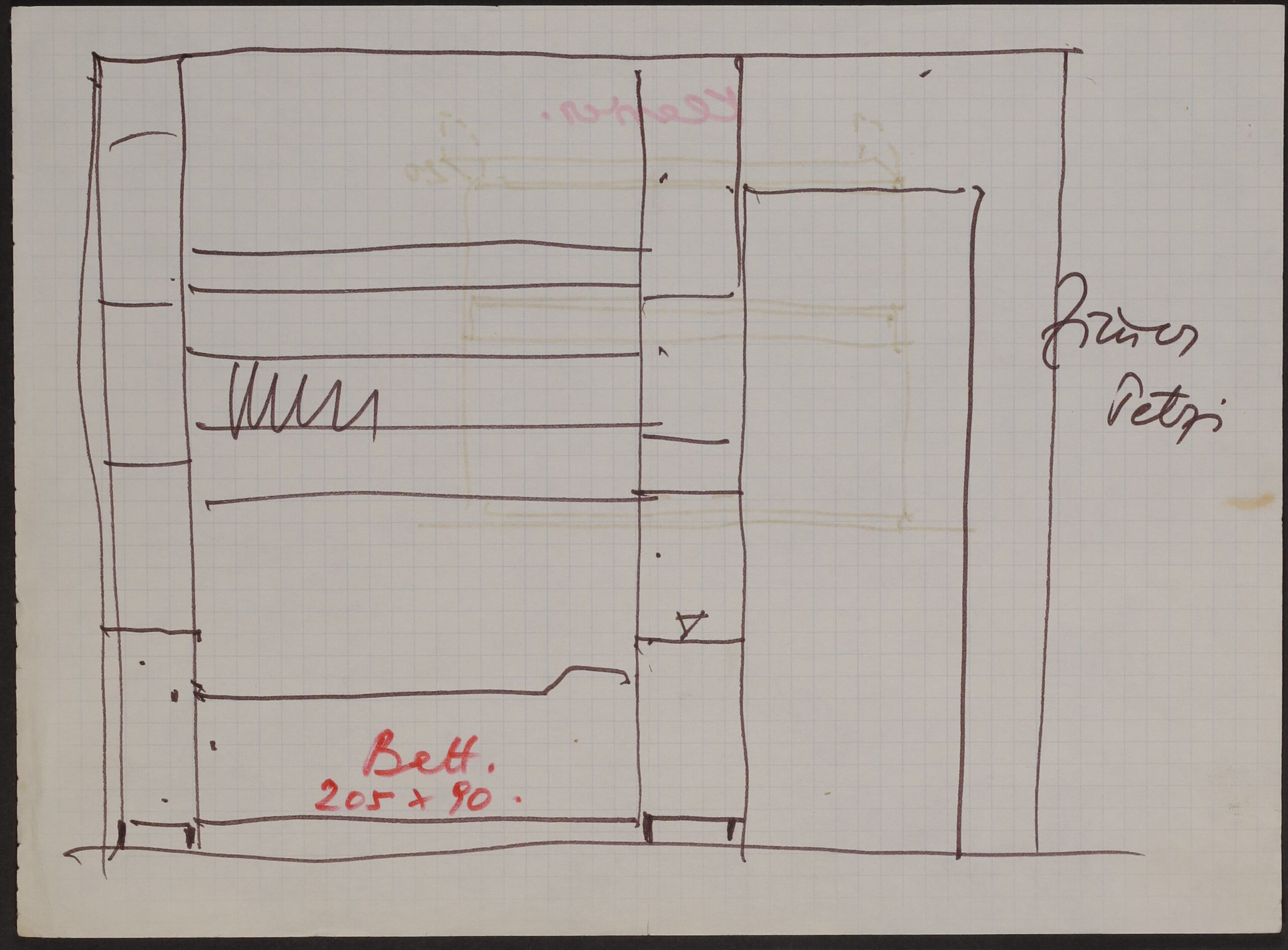 Skizze, Recto Skizze eines Bettes mit Wandschränken, Verso Skizze eines Klaviers, Anna-Lülja Praun, MAK Inv.nr. KI 16475-18-77-2-2