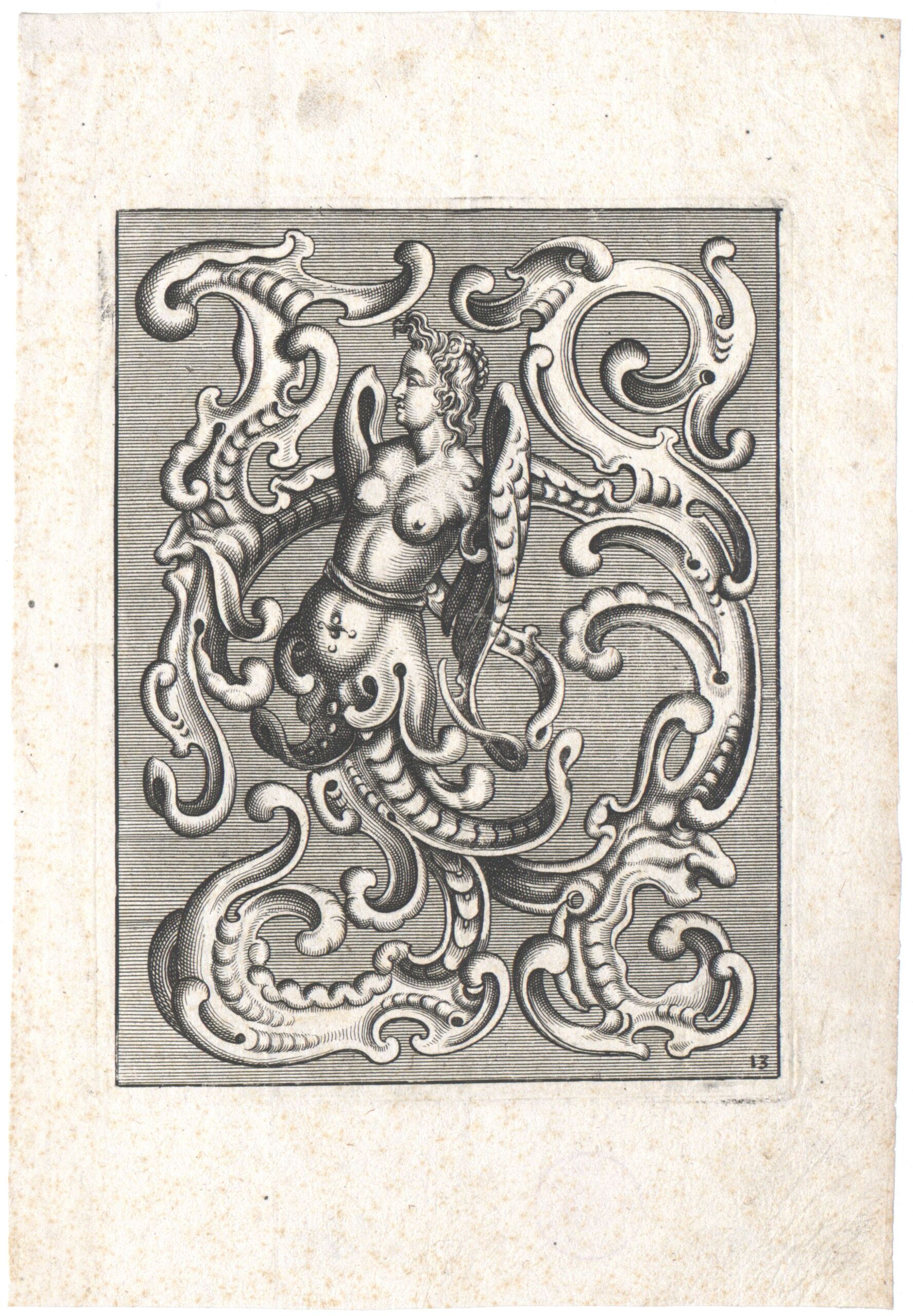 - Sirene mit Flügeln in Groteskenornament, Nr. 13 des ersten Teils des Neuen Zieratenbuch den Schreinern ... dienstlich (vom Bearbeiter vergebener Titel)