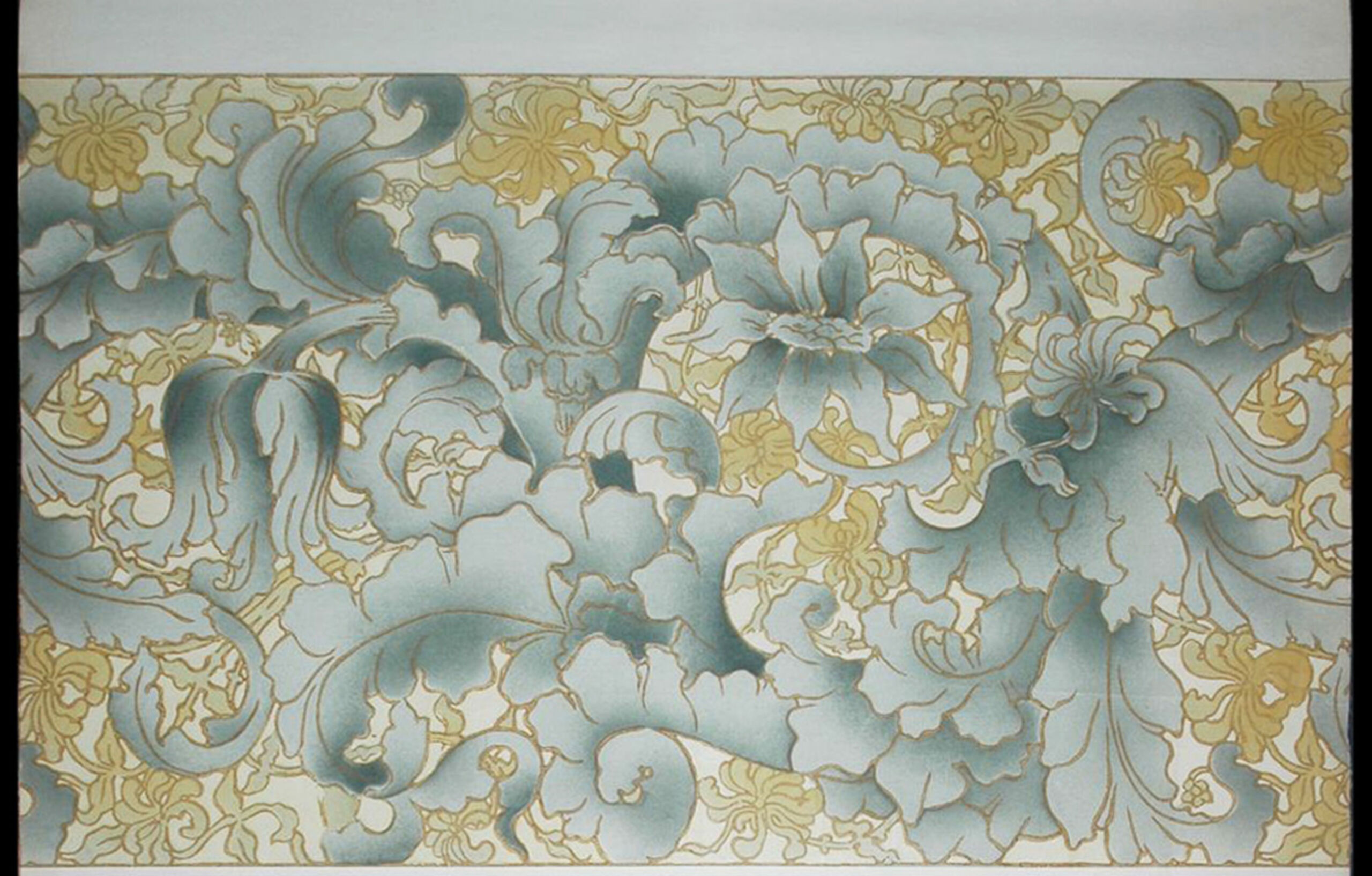 - Große blaue und kleine gelbliche Blatt- und Blütenranken auf hellem Grund (deskriptiver Titel)