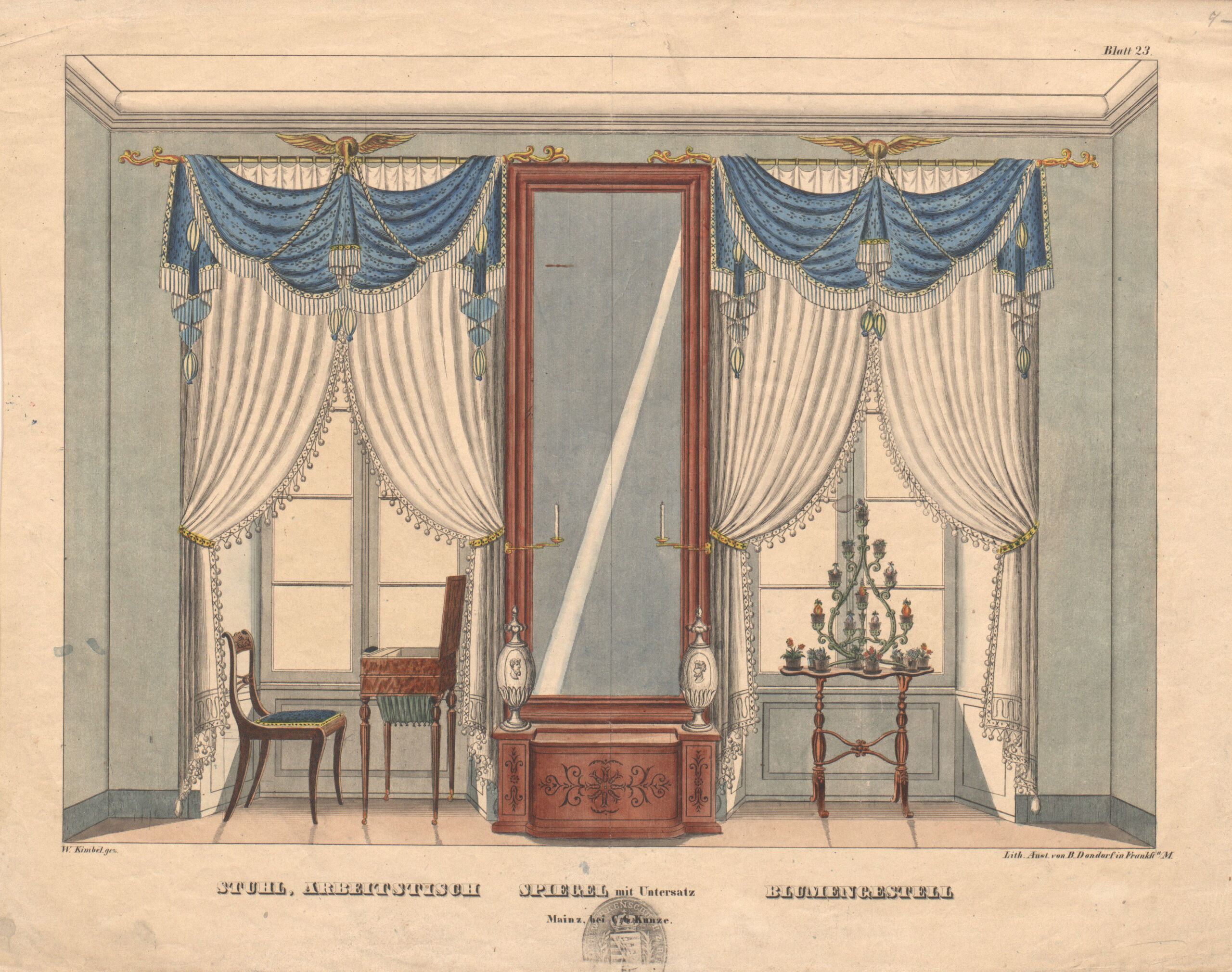 - Text am Objekt: Blatt 23 / STUHL, ARBEITSTISCH SPIEGEL mit Untersazu BLUMENGESTELL / W. Kimbel gez. Lith. Anst. v. B. Dondorf in Frkft a/M. / Mainz bei C. G. Kunze