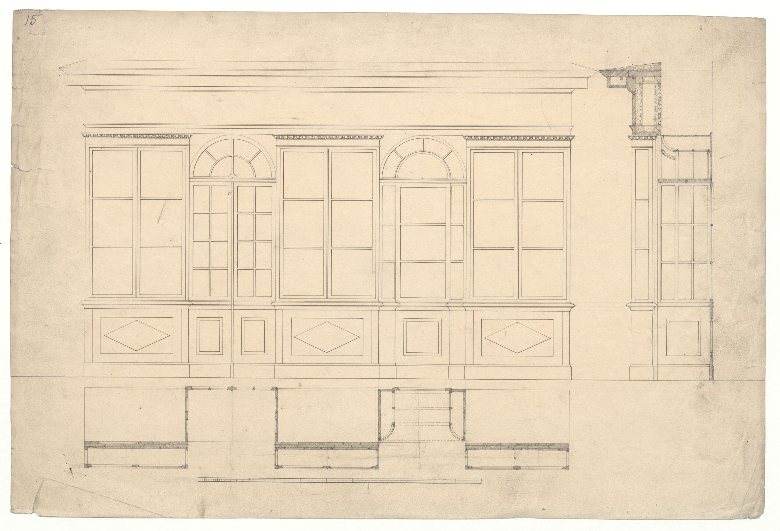 Aufriß, Grundriß und Querschnitt einer Wand auf hohem Sockel mit verglasten Wandschränken sowie Nischen samt alternativen Rundbogenfenstern im Wechsel. Oben wird die Wand von Eierstab und einer hohen Gebälkzone abgeschlossen. Auf dem Verso befindet sich zudem die Bleistiftskizze einer Ellipse.
