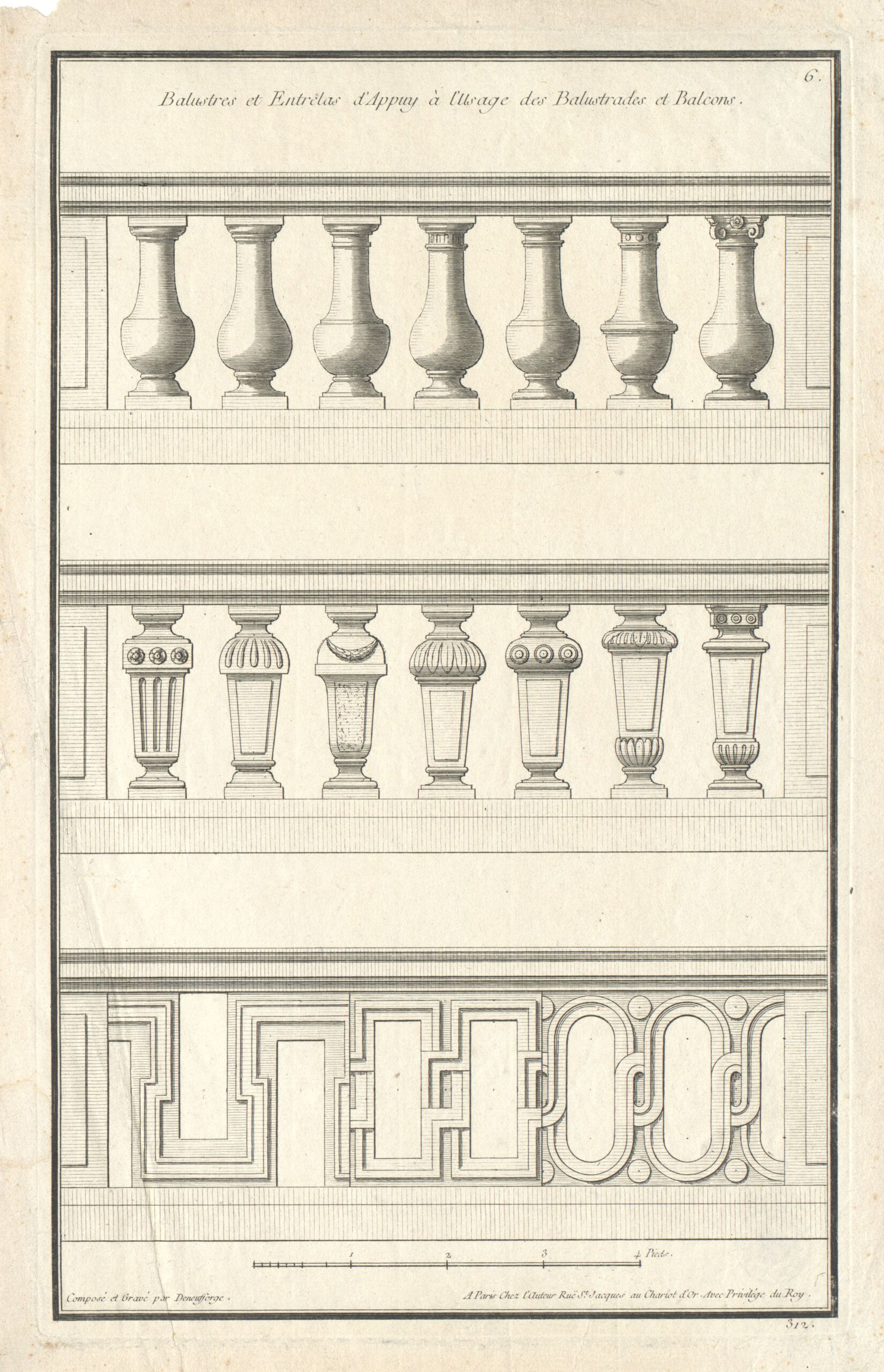 - text on object: Balustres et Entrelas d‘ Appuy à l‘ usage des Balustrades et Balcons / Composé et gravé par Deneufforge / A Paris chez l‘ Auteur rue S.t Jacques au Chariot d‘ or avec Privilege du Roy. / 6. 312