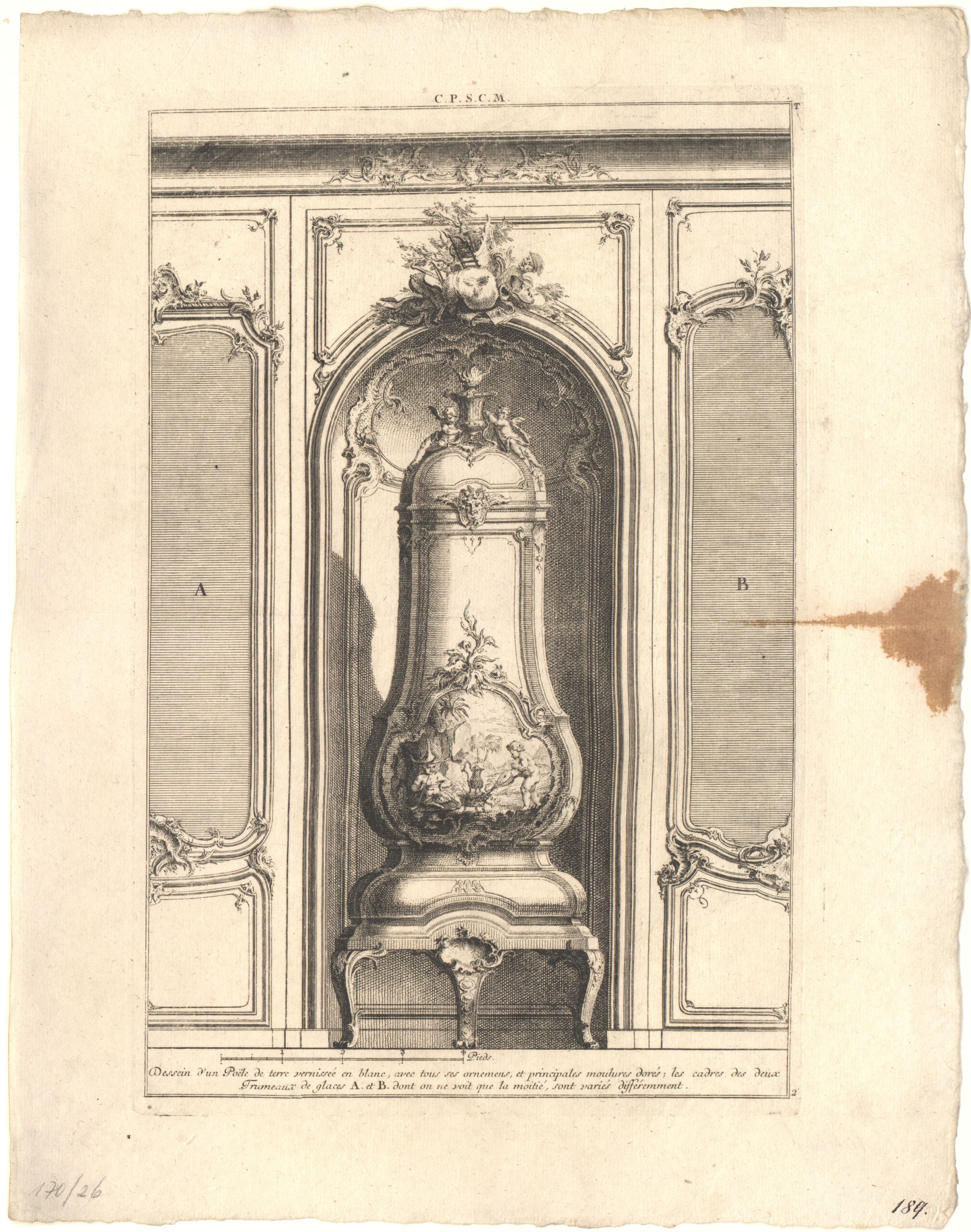 - text on object: C.P.S.C.M. / Dessein d‘ un Poele de terre vernissée en blanc, avec tous ses ornemens, et principales moulures dorés, les cadres des deux ... / T 2