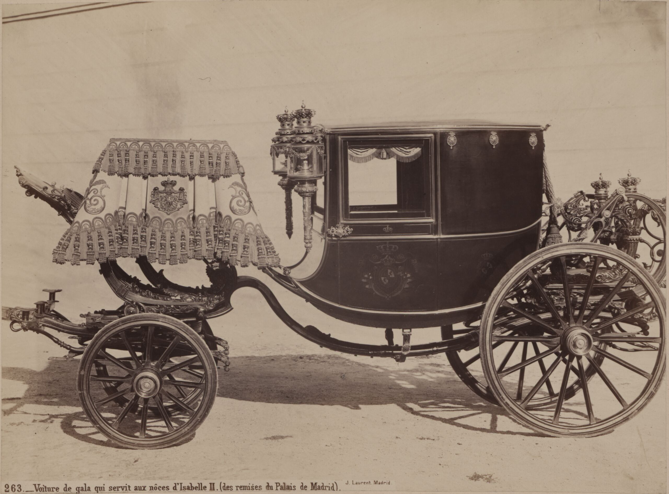 - text on object: [links]: 263._Voiture de gala qui servit aux noces d'Isabelle II. (des remises du Palais de Madrid). J. Laurent. Madrid. [Untersatzkarton, rechts]: Hochzeitswagen der Königin Isabella II. von Spanien / 1. Hlfte d. 19. Jhdts.