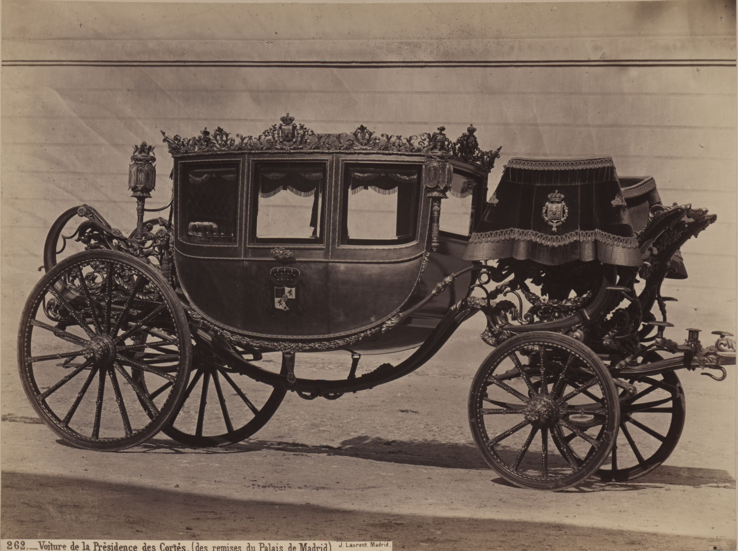 - text on object: [links]: 262._Voiture de la Prèsidence des Cortés (des remises du Palais de Madrid). J. Laurent. Madrid. [Untersatzkarton, rechts]: Wagen des Präsidenten der Cortes. Spanisch, 18. Jh. (Ende)