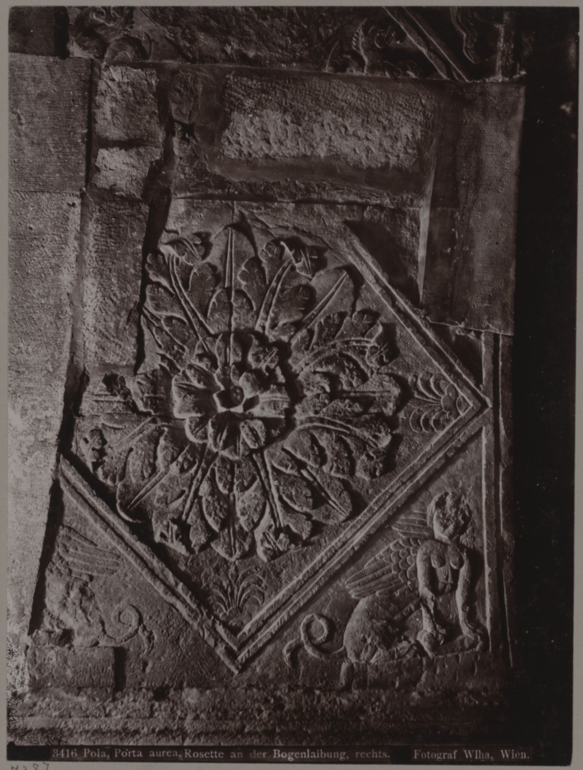 - text on object (mittig unten) : 3416 Pola, Porta aurea, Rosette an der Bogenlaibung, rechts. / Fotograf Wlha, Wien.