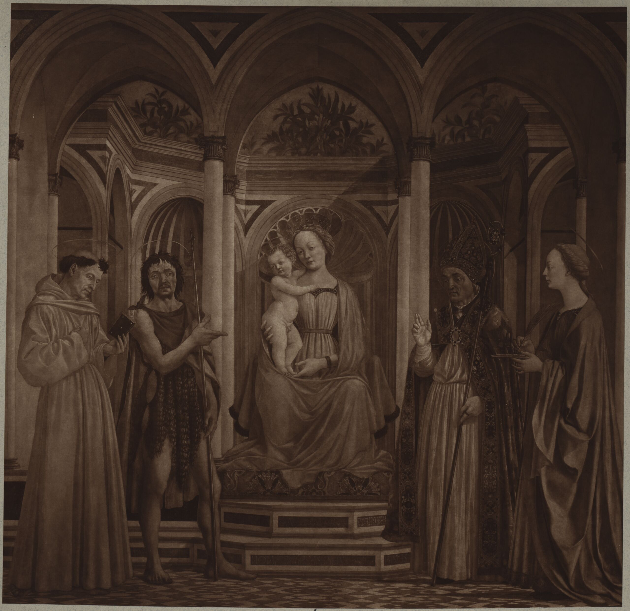 - text on object: [Untersatzkarton, links unten]: EPREUVE INATERABLE IMPRIMEE DE CHARBON / REPRODUCTION INTERDITE 1901[Untersatzkarton, mittig unten]: GALERIE ROYALE DES OFFICES A FLORENCE / DOMENICO VENEZIANO / NOTRE-DAME AVEC L'ENFANT ET DES SAINTS[Untersatzkarton, rechts unten]: MAISON AD. BRAUN & C. DORNACH, PARIS & NEW-YORK / BRAUN, CLEMENT & C. SUCC.rs