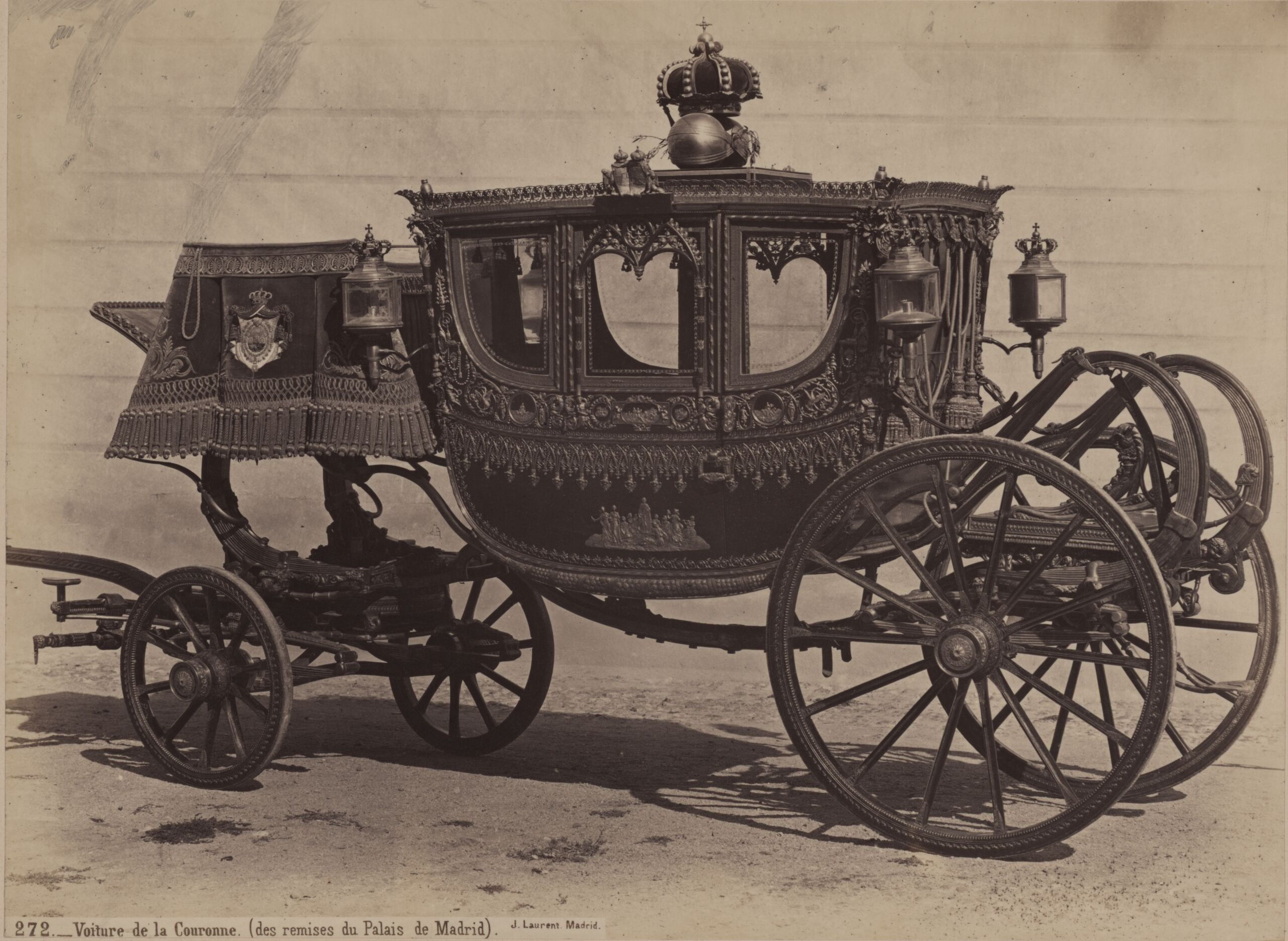 - text on object: [links]: 272._Voiture de la Couronne. (des remises du Palais de Madrid). J. Laurent. Madrid. [Untersatzkarton, rechts]: Spanischer Krönungswagen vom Anfang des 19. Jhdts.