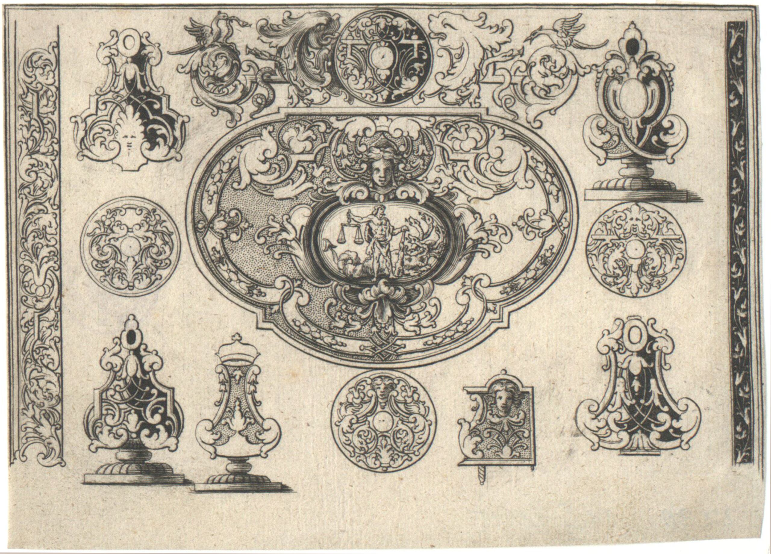 ornamental engraving, Goldschmiedearbeiten, Blatt aus einer Folge von Kopien nach P. Bourdon, Pierre Bourdon, MAK Inv.nr. KI 2280-6