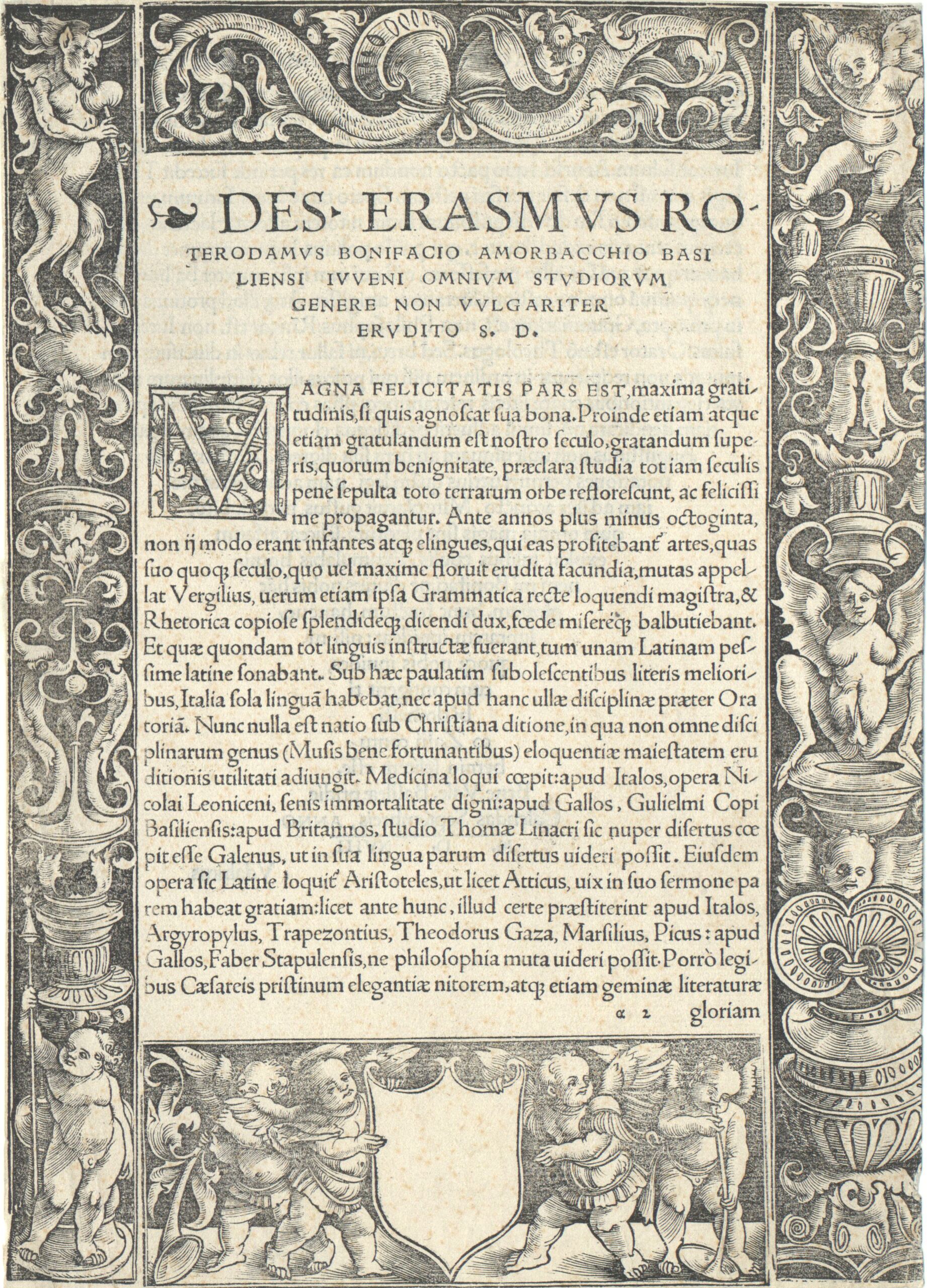 - text on object: DES ERASMUS RO/ TERODAMUS BONIFACIO AMORBACCHIO ...