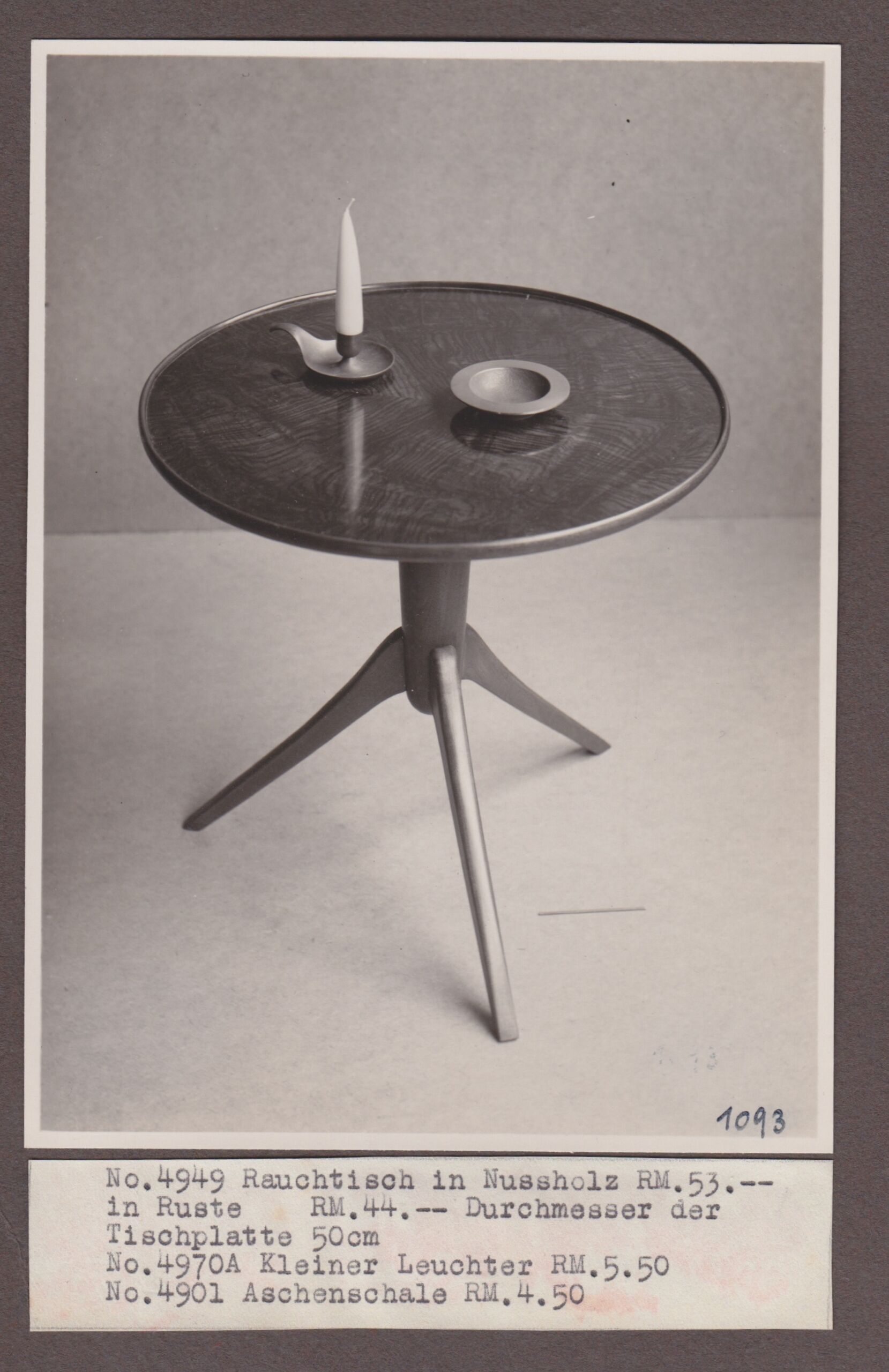 - text: No.4949 Rauchtisch in Nussholz RM.53.--/in Ruste RM.44.- Durchmesser der/Tischplatte 50 cm/No.4970A Kleiner Leuchter RM.5.50/No.4901 Aschenschale RM.4.50
