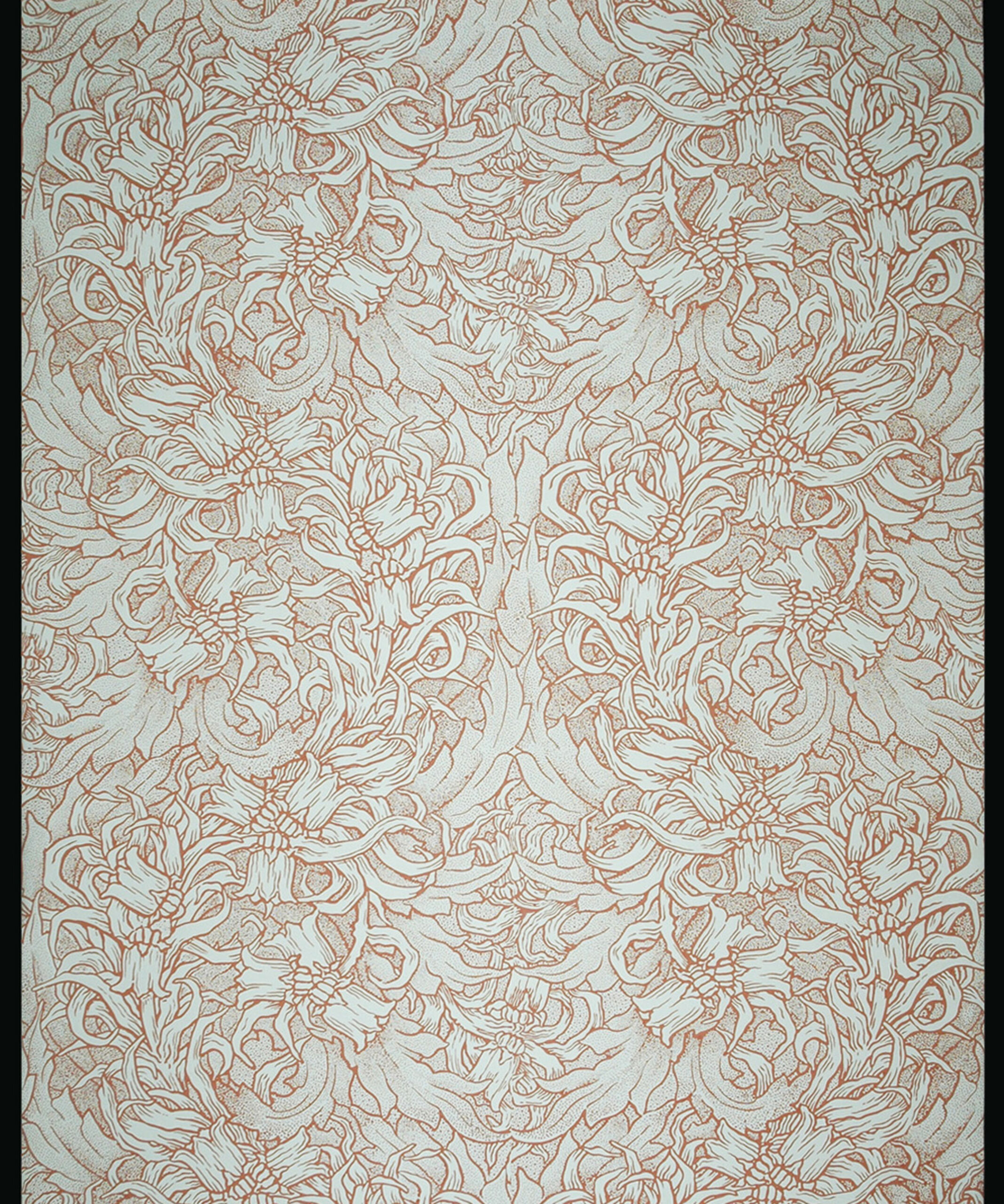 - Symmetrical pattern with small leaf and flowers, pale shades of red (descriptive title)