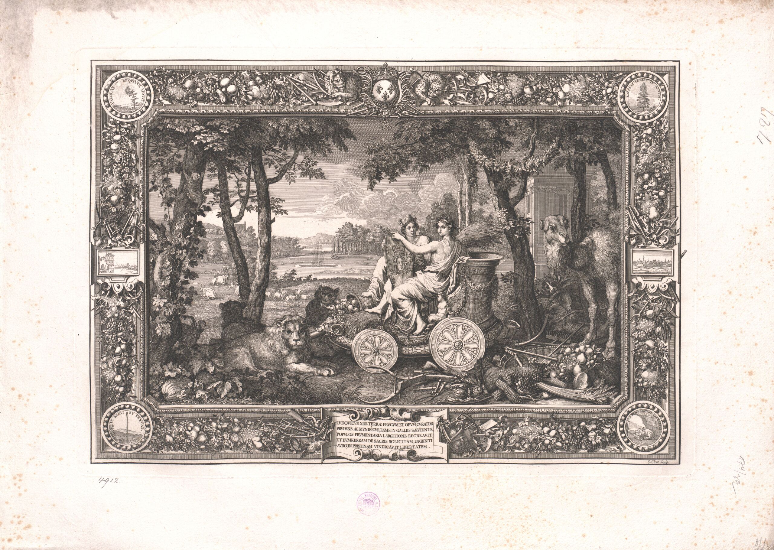 ornamental engraving, Tapisserie, die Erde repräsentierend, Blatt aus der Folge „Tapisseries du Roy ou sont representez les quatre Elemens et les quatre Saisons de L‘ Année“, Neudruck der Calcographie du Louvre, Paris, Charles Le Brun, MAK Inv.nr. KI 4912-21