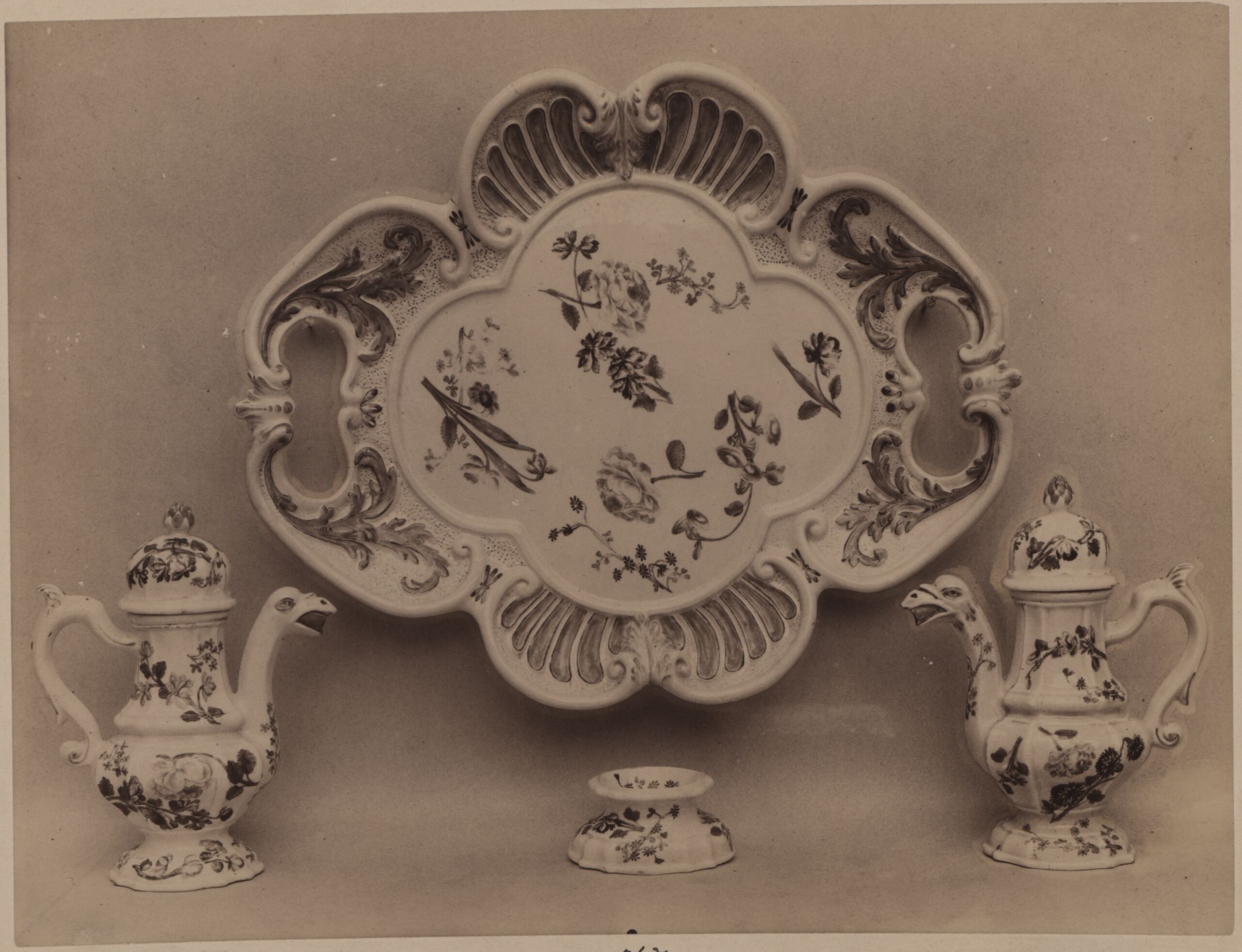 - Fotografie einer Porzellan-Platte, zweier Kännchen für Essig und Öl und einer Gewürzschale, um 1740 (given title)