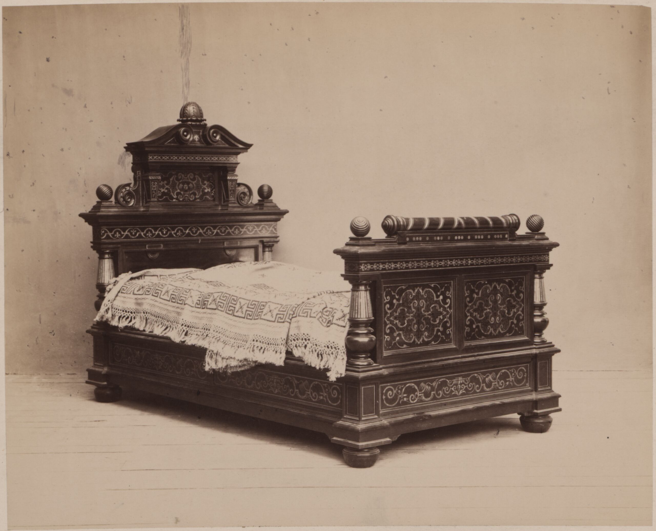 - Fotografie eines Betts aus der Tischlereischule in Grulich und einer Decke aus der Stickereischule in Wien (given title)